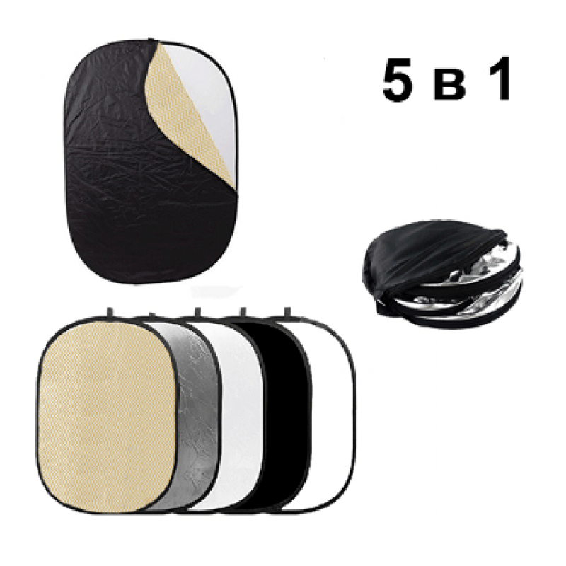 Овальный отражатель с пятью поверхностями (белая, черная, серебристая, золотая и на просвет). Незаменим при съемке с естественным освещением на природе, а также при съемке в студии. В сложенном виде компактен и удобен для транспортировки. Отражатель комплектуется сумкой с круговой застежкой-молнией и ручкой для переноски. Размер, см – 90x120.