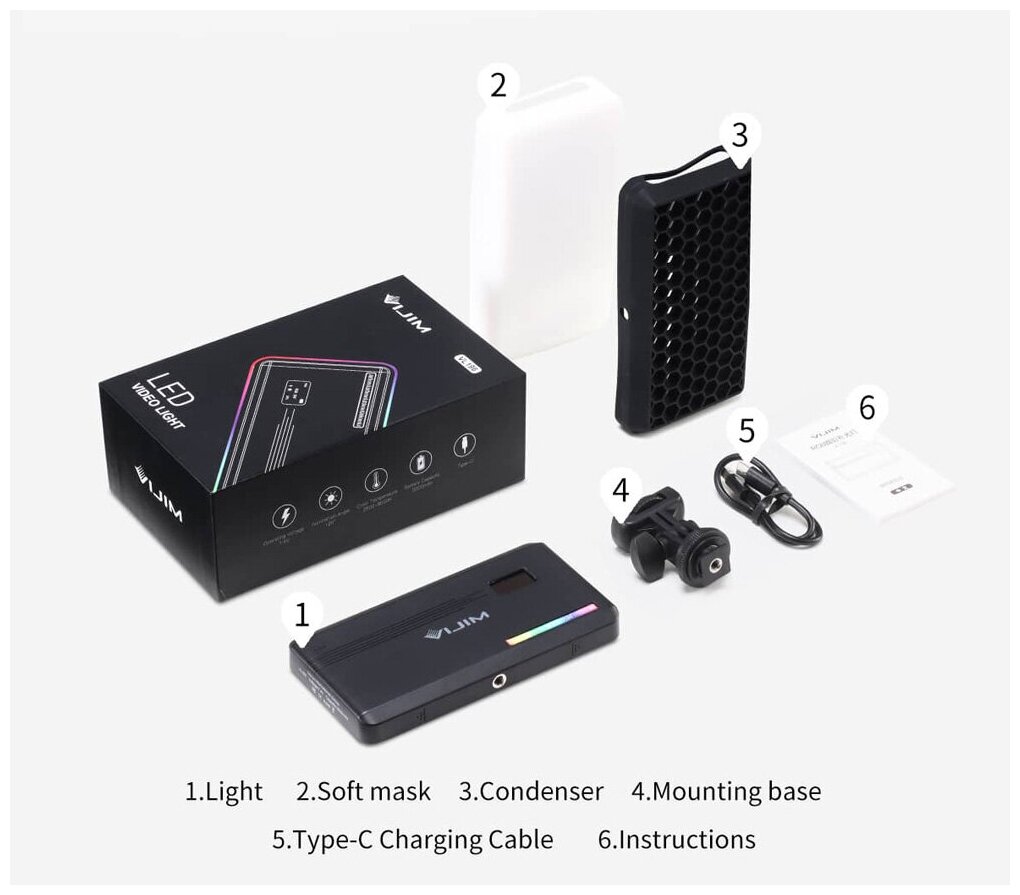 | Комплект поставки | Осветитель; Рассеиватель; Соты; монтажное основание; Зарядный кабель USB Type-C; Инструкция |