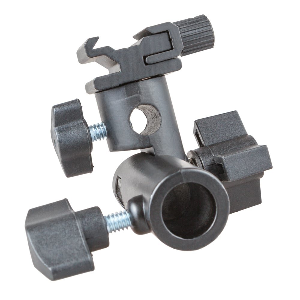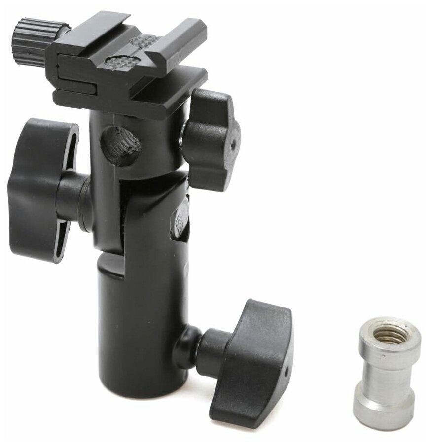 Держатель для накамерной вспышки и фотозонта, устанавливается на студийные стойки, ручные держатели и другие крепления с адаптером 5/8" (16 мм). В комплекте также идет переходник на винты 1/4" и 3/8". Универсальный башмак подходит для всех накамерных вспышек, за исключением старых моделей с башмаком Sony / Minolta. Недорогой и полезный аксессуар для использования накамерных вспышек на выносе.