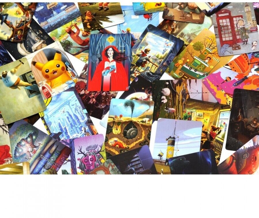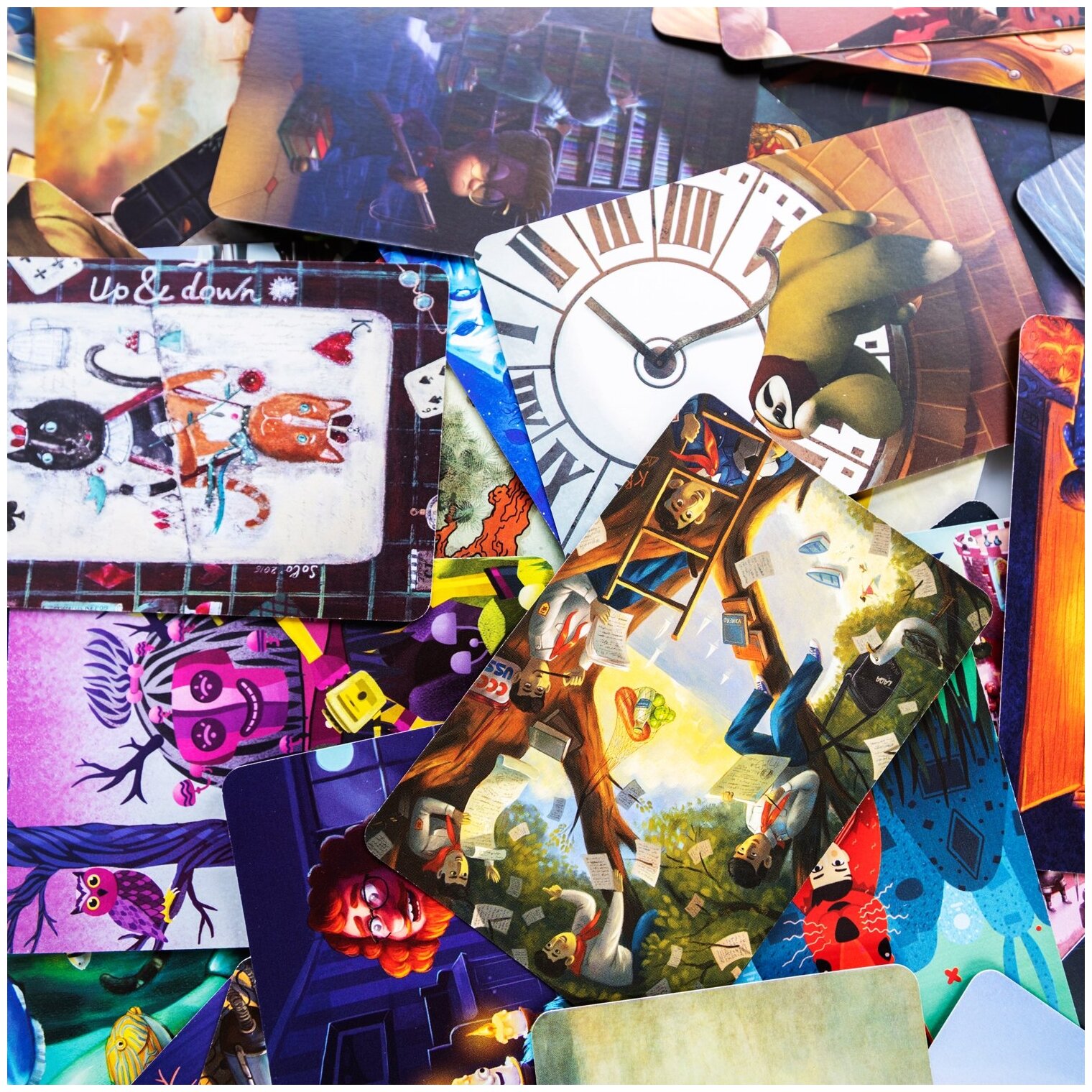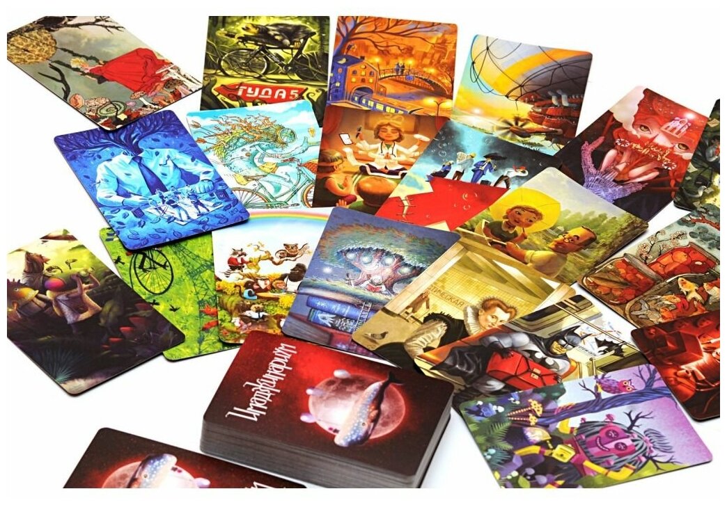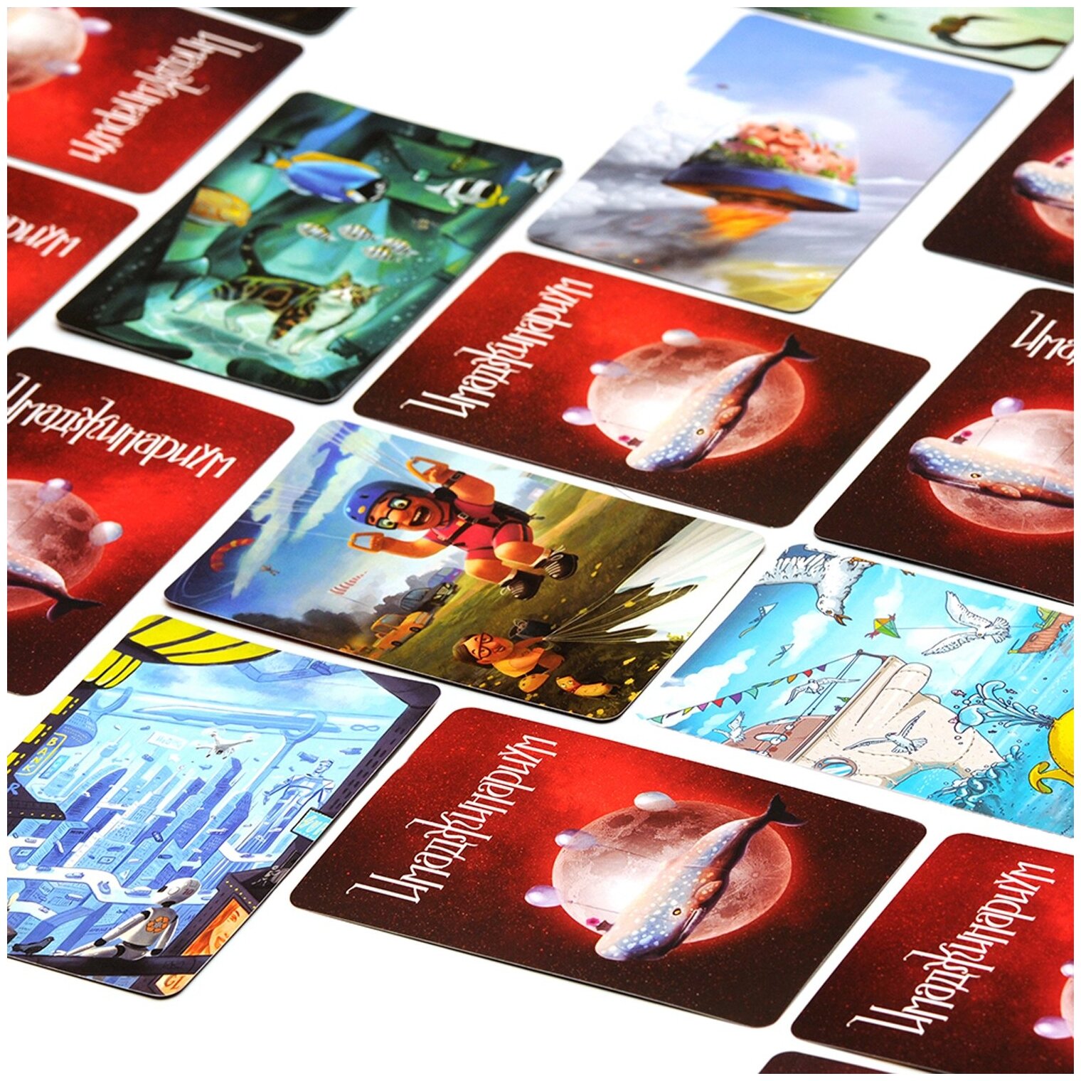 | Описание | «Имаджинариум» — это очень простая и очень интересная игра, в которой нужно придумывать ассоциации к необычным картинкам из коробки. Картинки рисовали сумасшедшие художники, поэтому ассоциаций — от самых простых, вроде «любовь», «зима», «принципиальность», до самых сложных и безумных, в духе «Всё правильно сделал», «Где драма? Опять нет драмы!», «Чак-чак! Беги быстрее!», может быть просто море.,,Подготовка к игре.,Каждый игрок выбирает себе слона и набор карточек для голосования того же цвета, что и слон. Карточек для голосования семь. Вам пригодится столько карточек, сколько человек играет. Если играет 6 человек, карточка с номером 7 вам не нужна.,Определите кто будет ходить первым.,,Ход игры,Слоны всех игроков выставляются на игровое поле на облачко 1.,Колода с карточками-иллюстрациями перемешивается и каждому игроку выдается на руки по 6 карточек.,Игрок загадывает ассоциацию.,Каждый ход один из игроков становится ведущим. Ведущий загадывает ассоциацию на одну из своих карточек, говорит эту ассоциацию вслух остальным игрокам и выкладывает на стол загаданную карточку рубашкой вверх.,,Угадывание карточки ведущего,Основная задача игроков — угадать, какую именно из выложенных на столе карточек загадал ведущий, и проголосовать за нее. Каждый игрок выбирает одну карточку для голосования с нужным номером и кладет рубашкой вверх. Ведущий не голосует и не комментирует выложенные на столе картинки. Голосовать за свою собственную картинку нельзя. Когда все приняли решение и проголосовали, карточки для голосования переворачиваются и происходит подсчет очков.,,Подсчет очков,Если карточку ведущего угадали все игроки, то он идет на 3 хода назад (или на поле 1, если он еще не продвинулся дальше третьего поля), а остальные игроки стоят на месте.,Если карточку ведущего никто не угадал, то ведущий идет на 2 хода назад. Плюс, очки получают игроки, чьи карточки угадали.,В любом другом случае по 3 очка получают все игроки, правильно угадавшие карточку. Ведущий получает 3 очка плюс по очку за каждого угадавшего его игрока.,Все игроки получают по одному очку за каждого игрока, который угадал их картинку.,,Игроки передвигают свои фишки на игровом поле на количество шагов, соответствующее количеству выигранных очков.,,В набор входит:,- Поле для подсчёта очков (сделанное прямо на «подиуме» на коробке).,- 98 крупных карт с картинками.,- 49 карточек для голосования для 7 игроков.,- 7 летающих слонов для передвижения по полю.,- Правила на русском языке.,,Количество игроков:от 4 до 7 человек.,Продолжительность |