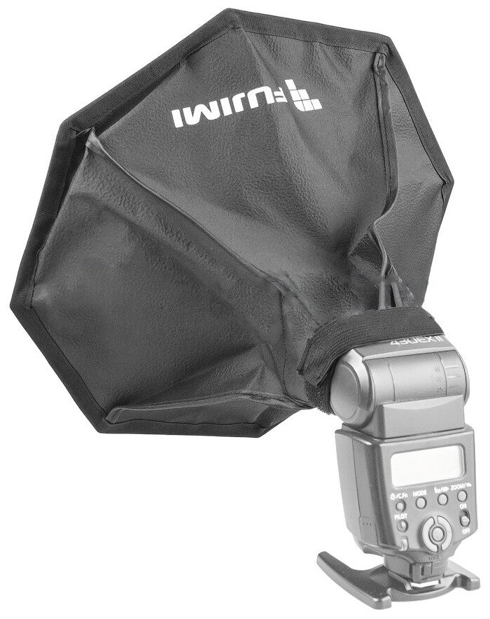 Октабоксы (восьмиугольные софтбоксы) любят многие фотографы за их красивый округлый блик в глазах модели. Небольшой универсальный октабокс Fujimi FJO-28 подходит для большинства накамерных вспышек. Рекомендуется для портретной съемки на выезде. Диаметр 28 см.