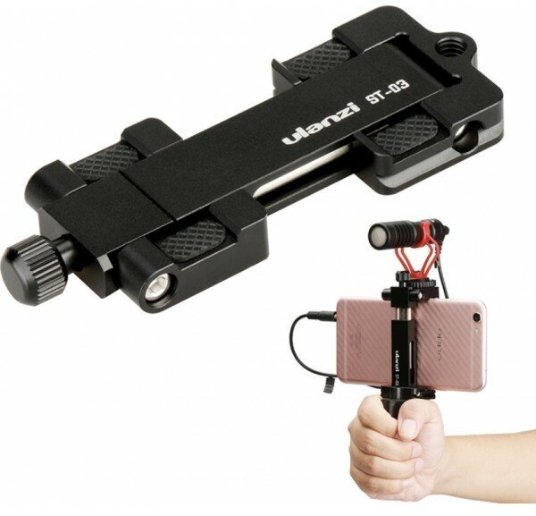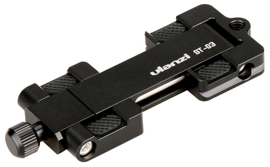 Простой и практичный металлический держатель для смартфонов шириной от 58 до 104 мм. Конструкция выполнена из сплава алюминия T6061, что гарантирует долговечность и прочность, а когда держатель не нужен, он легко складывается и убирается в карман или сумку. В нижней части расположено резьбовое гнездо 1/4", которое позволяет установить телефон на любой штатив, монопод или другой держатель с соответствующим винтом. Нижняя часть также выполнена в форме ласточкиного хвоста, благодаря чему ее можно напрямую устанавливать в штативные головки системы Arca Swiss. В верхней части выточен холодный башмак, позволяющий установить, например, микрофон или небольшую лампу подсветки. Размеры: 106 х 38 мм Вес: 87 г