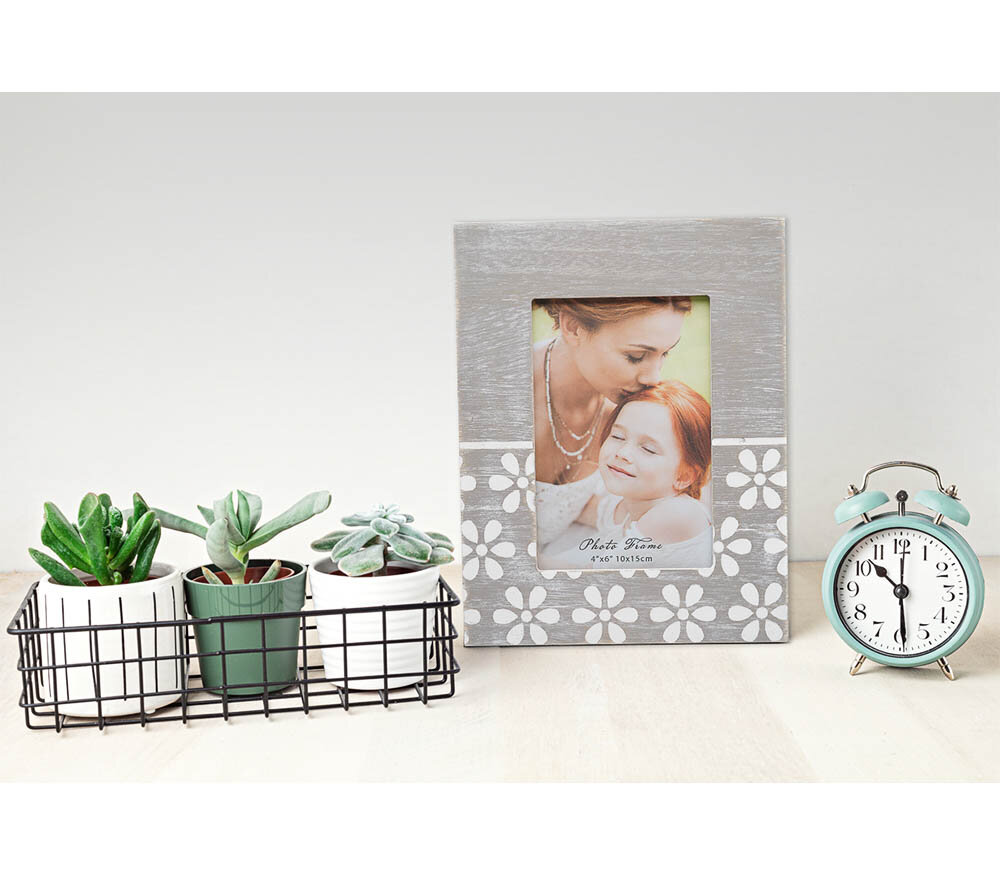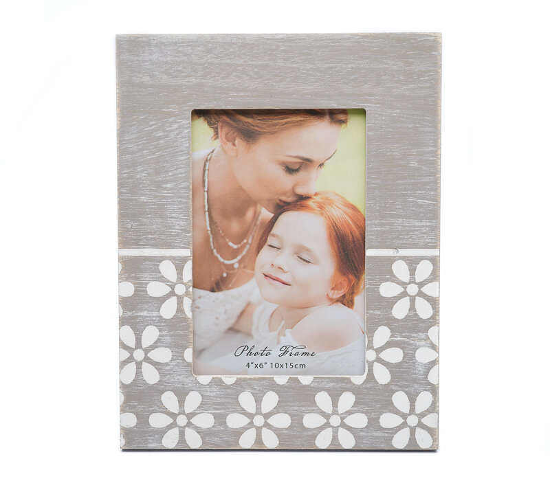 Фоторамка серого цвета с защитным стеклом и орнаментом из цветов, предназначенная для горизонтального фото 10х15 см. Сзади имеется ножка-подставка для установки на горизонтальную поверхность. Материал - МДФ.