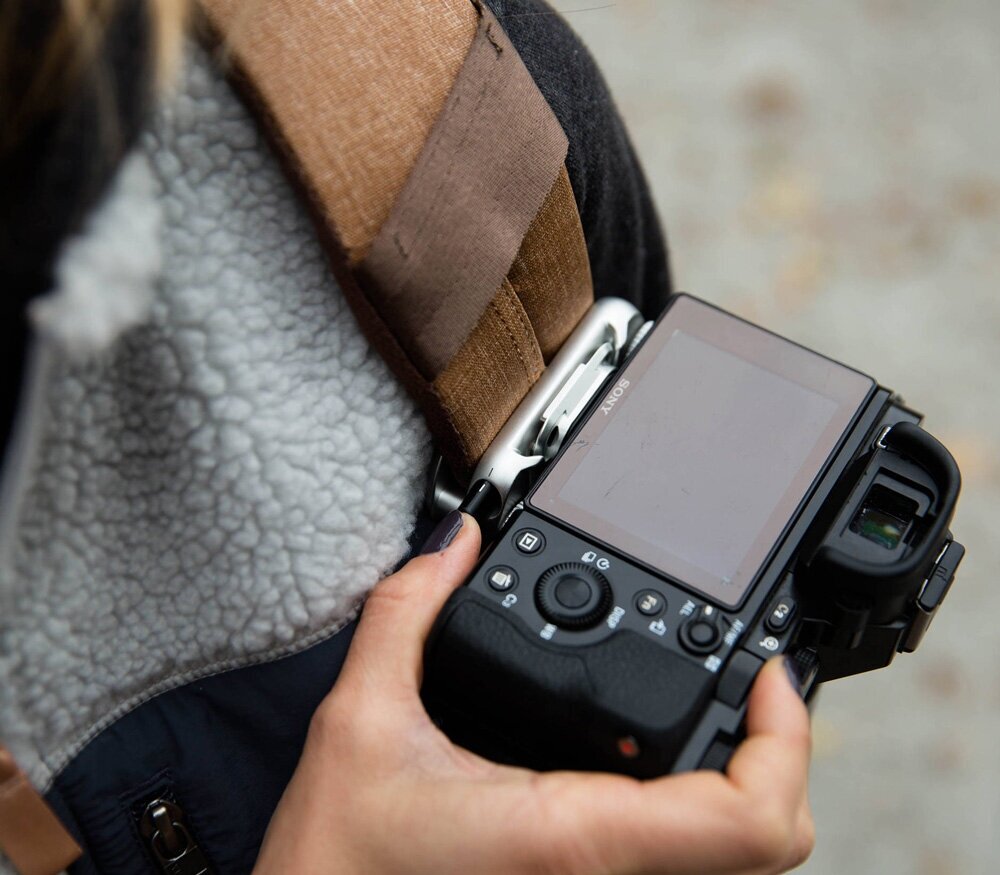 Peak Design Capture V3 – металлическая пряжка для крепления камеры на поясном ремне, нагрудной лямке рюкзака или любом другом ремне шириной до 6.35 см и толщиной до 2.2 мм. Съемная площадка крепится в штативное гнездо камеры, стандартная площадка позволяет ставить камеру в любом из 4 направлений. Например, поставив камеру боком, удобно менять объективы. Боковое крепление также хорошо подходит для камер с короткими объективами. Пряжку можно установить и на более широкие ремни, немного сжав их по краям.Пряжка совместима с площадками системы Arca Swiss: вы можете снять камеру с пояса и поставить на штатив (и обратно). Для владельцев штативов Manfrotto можно приобрести альтернативную площадку, которая подходит к головкам системы RC2 (с площадкой 200PL).Пряжка Peak Design Capture V3 подходит как для длительного ношения камеры, так и просто для того, чтобы быстро освободить руки на время передышки между съемками – поэтому она пользуется большой популярностью среди профессиональных фотографов (спорт, репортаж, мероприятия). Крепление выдерживает нагрузку более 90 кг, поэтому камера останется на месте, даже если кто-то попробует вырвать ее силой.Камера с площадкой легко устанавливается в пряжку (вы услышите «клик»), а чтобы вытащить ее обратно, требуется нажать на кнопку. Для безопасности в общественных местах вы можете повернуть штифт замка в сторону, что заблокирует замок. Камера немного ходит в креплении - это не является признаком брака, она никуда не выскочит. Это сделано для того, чтобы фотоаппарат можно было легко, не глядя, поставить в пряжку, вместо того чтобы долго нащупывать правильное положение.Дополнительные аксессуары: для тяжелых комплектов (полнокадровые камеры с телеобъективами и тому подобное) рекомендуется широкая подушка Pro Pad, которая распределяет вес камеры по большей площади. Площадку можно прикрепить к ремням Peak Design или ремням других производителей с помощью специальных анкеров (Anchors). Наконец, вы можете заменить стандартную площадку на адаптер для объективов, адаптер для биноклей, или присоединить к ней экшен-камеру для нагрудного ношения.Peak Design Capture V3 отличается от предыдущих версий более тонким и более легким дизайном: выступы стали гораздо меньше, поэтому теперь углы не задевают тело при наклонах или широких движениях рук. Все выступающие части сглажены при обработке. Использование стало более простым и интуитивно понятным.