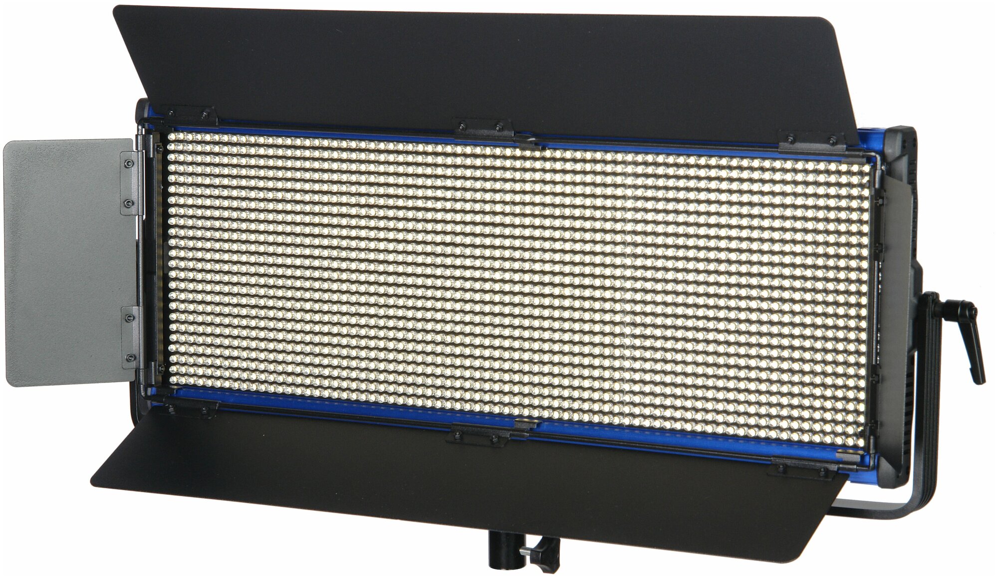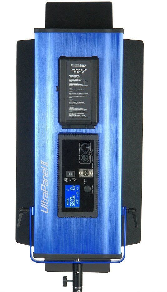Прочность конструкции обеспечивает корпус из алюминиевого сплава. Благодаря современному дизайну легкие синие панели не затеряются среди другого оборудования на площадке. С помощью надежного кронштейна-лиры, который можно перемещать вдоль корпуса, осветитель устанавливается на стойки, краны, подвесные системы с посадочным местом 5/8”. В комплект входят съемные металлические шторки со стальными крепежными элементами.
