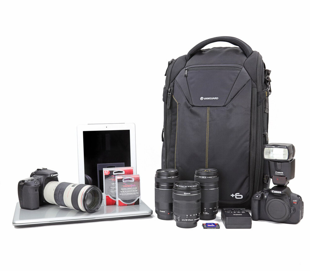Большой рюкзак профессионального уровня для 1-2 камер с установленными объективами, нескольких дополнительных объективов, вспышки и прочих аксессуаров. Рюкзак полностью раскрывается для удобной укладки всей техники, а также предоставляет боковой доступ для быстрого извлечения камеры. Верхнее отделение предназначается для личных вещей, хотя туда можно положить и вторую камеру: его стенки также уплотнены и защищают от ударов. «+6» означает, что при необходимости рюкзак в прямом смысле слова расширяется на 6 см (в нижней части), что помогает разместить более габаритные вещи: например, камеру с батарейной ручкой. Имеется отдельный карман для большого ноутбука (вплоть до 15.6") и планшета типа Apple iPad. Штатив или монопод можно закрепить сбоку: есть специальная извлекаемая чаша для ножек и ремни для надежной фиксации.Комфорт: имеет анатомическую спинку с подушками в районе лопаток и поясницы, а также широкими вентиляционными каналами между ними. В наличии есть поясной ремень и нагрудная лямочная стяжка, которая регулируется по высоте. Широкую и мягкую верхнюю ручку вы сможете оценить, когда тяжелый рюкзак придется снять с плеч и держать в руке: например, в общественном транспорте. Рюкзак также имеет неколько небольших карманов для организации личных вещей: документов, телефона, денег, ключей и так далее. Для особо ценных вещей есть небольшой скрытый кармашек на спинке, прямо между лопаток. Для защиты от непогоды есть чехол-дождевик.