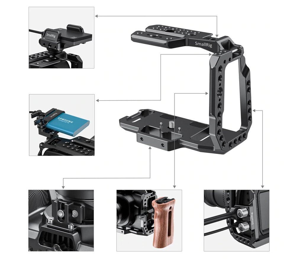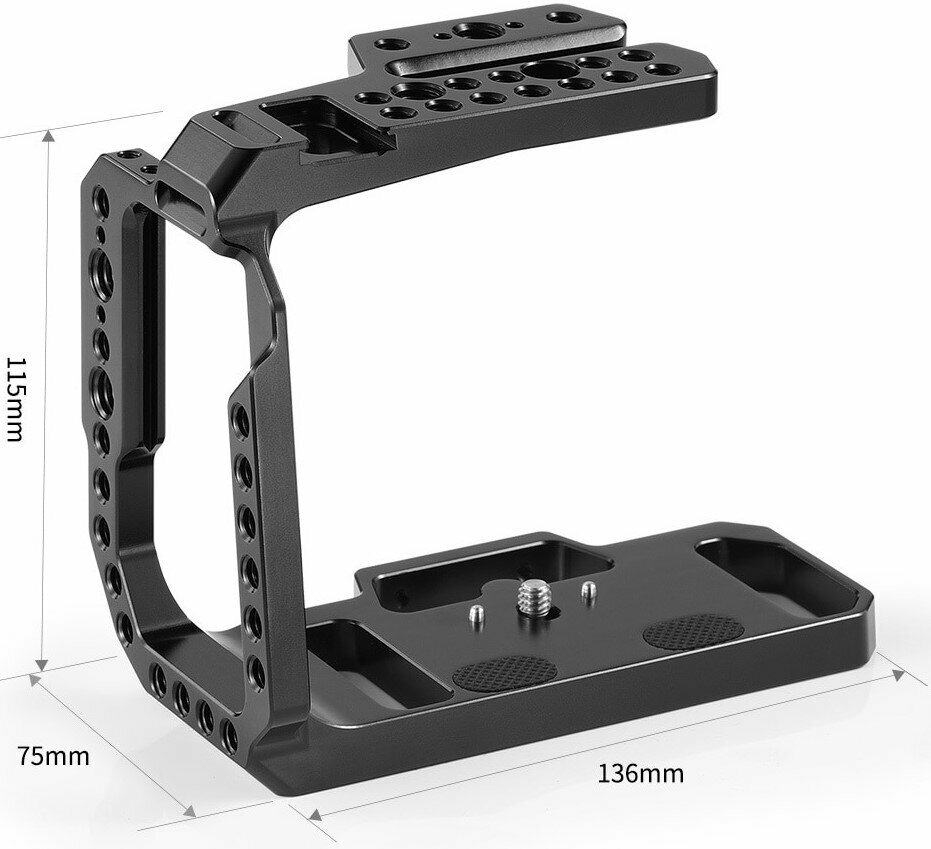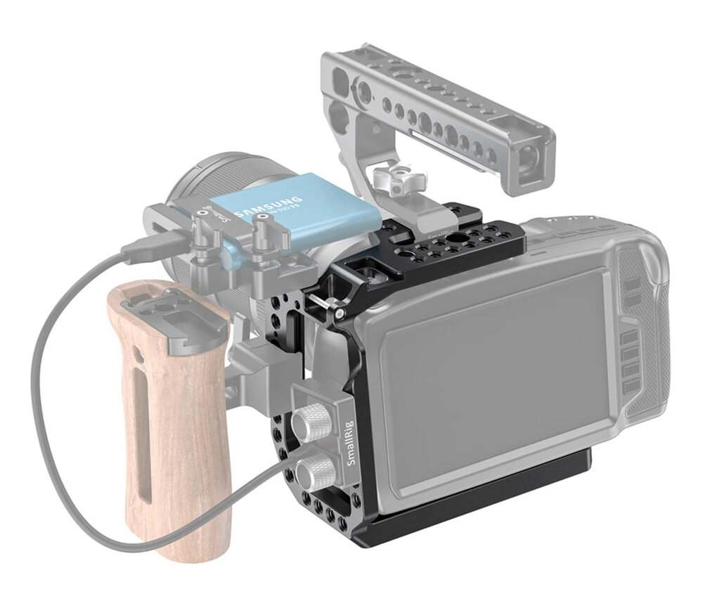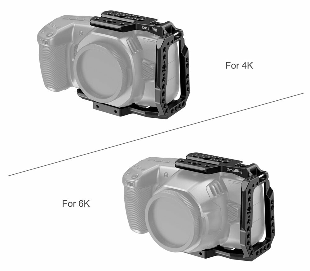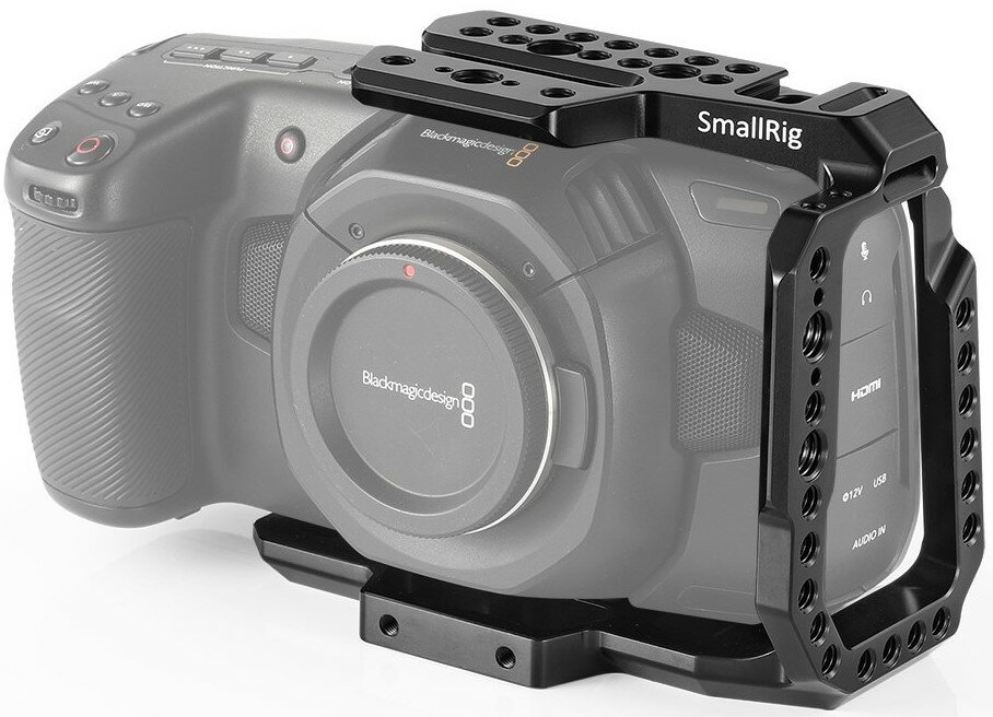 Клетка для цифровых камер SmallRig Half Cage for Blackmagic Design Pocket Cinema Camera 4K & 6K Основные особенности: Специальная клетка для камер BMPCC 4K и 6KНесколько типов креплений для аксессуаров (адаптер NATO, резьбовые отверстия 1/4" и 3/8", разъем ARRI и «холодный башмак»).Дизайн клетки, повторяющий форму корпуса камеры для беспрепятственного доступа к аккумулятору и SD-карте.Надежная фиксация камеры винтами ¼” с двух сторон. Направляющие штифты и резиновые накладки на нижней площадке, предотвращают смещение камеры.Клетка совместима с держателем SmallRig для SSD-накопителя Samsung T5, фиксатором кабеля HDMI & SSD, адаптером Metabones Adapter Support и другими аксессуарами.SmallRig QR Half Cage for Blackmagic Design Pocket Cinema Camera 4K & 6K – новая версия клетки повторяющая форму корпуса камеры. Клетка с двух сторон (с верху и снизу) надежно фиксируется винтами ¼”. Направляющие штифты и резиновые накладки на нижней площадке, предотвращают смещение камеры.На верхней и левой сторонах клетки расположены встроенные адаптеры NATO, на которых можно закрепить ручки SmallRig NATO Top Handle 1955 или SmallRig Wooden NATO Side Handle 2187 для съемки с рук. Несколько резьбовых отверстий ¼” и 3/8” и разъем ARRI предназначены для установки аксессуаров, например фиксатора кабеля SmallRig 2246B или держателя SmallRig 2245B для SSD-накопитель Samsung T5. Клетка совместима с адаптером SmallRig Metabones Support 2247, позволяющим уменьшить нагрузку тяжелых объективов на байонет камеры.Важно:Для клетки CVB2254B, необходимо использовать обновленные версии держателя жесткого диска SmallRig 2245B и фиксатора кабеля SmallRig 2246B.При использовании клетки с камерой BMPCC 6K адаптер SmallRig Metabones Support 2247 НЕ может быть установлен на клетку.