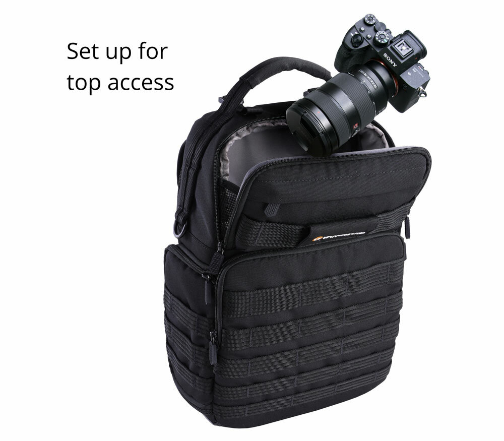 «Тактический» рюкзак VEO Range T37M вмещает беззеркальную камеру, до пяти объективов, 10" планшет и небольшой туристический штатив (на внешнем креплении). В верхней части предусмотрено небольшое отделение для личных вещей (извлекаемое). Снаружи рюкзак обшит лентами типа MOLLE, которые позволяют навешивать дополнительное оборудование (чехлы, подсумки) в любой необходимой конфигурации. Основной доступ к содержимому открывается через спинку, также есть боковой лючок для быстрого извлечения камеры, также можно обеспечить вертикальный доступ.В комплекте с рюкзаком поставляются 2 модуля: крепление для штатива и чехол для бутылки воды, их можно разместить на лентах так, как вам это удобно, или же снять и не использовать, если в них нет необходимости.Комфорт ношения обеспечивается благодаря анатомической спинке со специальными подушками для лопаток и поясницы и с вентиляционными каналами. Лямки со вспененным уплотнителем ложатся на плечи мягко, есть регулируемая по высоте нагрудная стяжка. Также имеется верхняя ручка и петля на спинке для крепления рюкзака на ручке от сумки-тележки. Поясного ремня здесь нет, так как это достаточно небольшой рюкзак (объем около 20 литров).Рюкзак оснащен мягкими стенками по всему периметру, что обеспечивает отличную защиту для вашего фотоаппарата и аксессуаров. Для защиты от дождя имеется водонепроницаемый чехол.