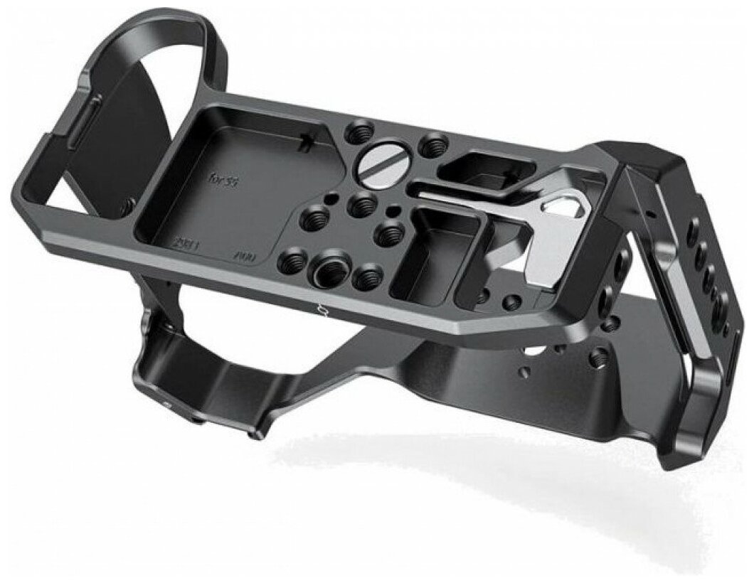 Прочная клетка из цельного куска алюминия для камеры Panasonic Lumix S5 и S1R. Множество резьбовых гнезд 1/4"-20, 3/8"-16 и Arri 3/8”, холодный башмак и планка НАТО (слева) позволяют установить всё разнообразие дополнительных аксессуаров, в том числе: верхние и боковые ручки, мониторы, рекордеры, микрофоны, лампы постоянного света, фиксаторы для HDMI кабеля и направляющую для фоллоу-фокуса. Справа и слева предусмотрены крепления для ремня. Клетка обеспечивает свободный доступ к батарее, карте памяти, всем интерфейсам и большинству органов управления.
