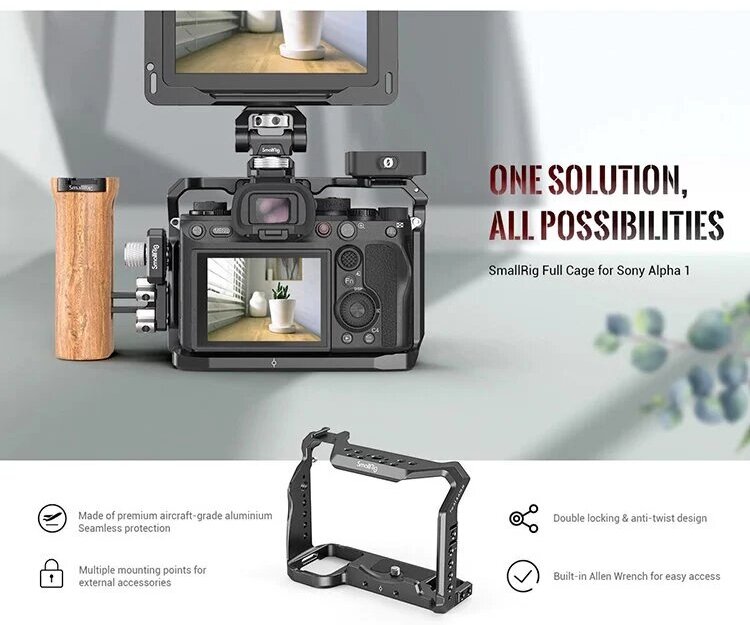 Прочная клетка для камер Sony A1 и A7S III, выточенная из цельного бруска алюминия. Множество резьбовых гнезд 1/4"-20, 3/8"-16 и Arri 3/8”, холодный башмак (сверху) и планка НАТО (слева) позволяют установить всё разнообразие дополнительных аксессуаров, в том числе: верхние и боковые ручки, мониторы, рекордеры, микрофоны, лампы постоянного света, фиксаторы для кабелей и 15-мм направляющие. Предусмотрены проушины для ремня, в том числе кистевого. Клетка обеспечивает камере защиту от случайных ударов, одновременно предоставляя свободный доступ к батарее, карте памяти, всем интерфейсам и органам управления. Вес клетки составляет всего 194 г.
