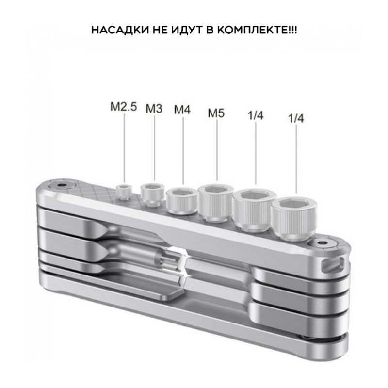 Складной мультитул включает 7 инструментов: шестигранные ключи 2.5, 3, 4 и 3/16, плоскую отвертку, крестовую отвертку типа Филлипс и ключ под «звездочку» Torx T25. Сбоку предусмотрены резьбовые гнезда M2.5, M3, M4, M5, 1/4, в которых можно носить запасные винты. Все инструменты выполнены из прочной нержавеющей стали, а боковинки корпуса - из алюминиевого сплава.