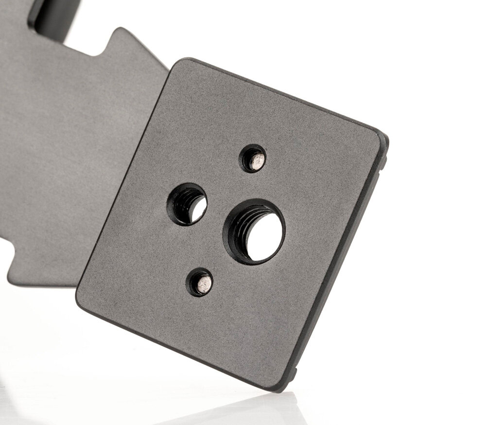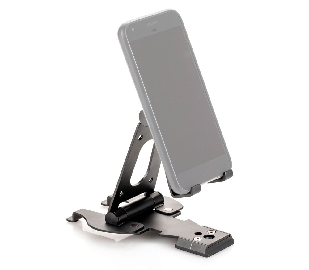 Универсальный держатель разработан для установки планшетов и смартфонов любых размеров. В основании имеется две резьбы 1/4" и 3/8" для установки на любые опоры – штатив, штативную голову, монопод, слайдер и т. п. Форма основания позволяет установить держатель на головы системы Arсa-Swiss и Manfrotto RC2. Держатель также можно использовать как настольную подставку: два опорных рычага обеспечат отличную поддержку, а резиновые накладки предотвратят случайное соскальзывание устройства. Компактная складная конструкция и удобный чехол для транспортировки и хранения.Изготовлен из высококачественного алюминия, обработанного на станке с ЧПУ.