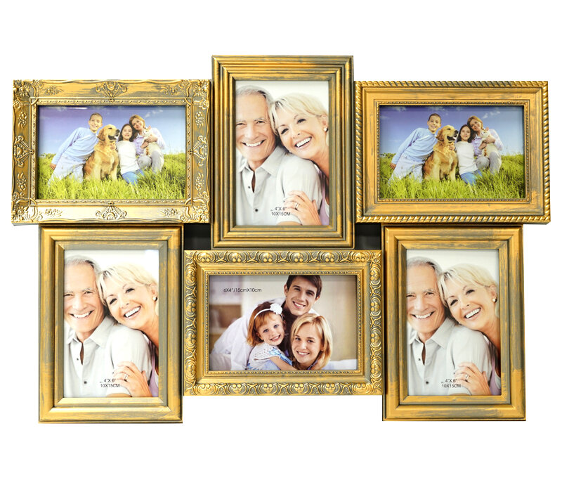 Мультирамка “Fotografia”. Пластиковый коллаж золотистого цвета с потёртостями на 6 фотографий 10 х 15 см. Материал задника: толстый и плотный лист оргалита. Материал вставки - надежное стекло с толщиной 1,5 мм. Поворотный зажим из пластика на обратной стороне обеспечивает легкость доступа и удобство эксплуатации, постоянное плотное прилегание фотографии к поверхности. Соединение углов выполнено с помощью особых металлических крепежей располагаемых внутри профиля, это обеспечивает плотную и ровную фиксацию багета друг к другу с отсутствием просветов и перекосов. Также предусмотрена защита углов рамки с помощью картонных уголков.