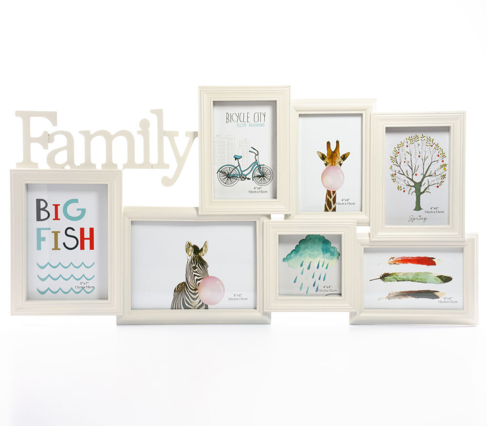 Мультирамка "Fotografia". Пластиковый коллаж на 7 фотографий с надписью "Family": 4 фотографии 10х15 см, 1 фотография 9х9 см, 2 фотографии 13х18см. Материал: пластик (PVC), обладает прочной структурой, надежен и долговечен в эксплуатации. Имеются металлические крепления для настенного подвеса. Материал задника: толстый и плотный лист оргалита. Материал вставки - стекло с толщиной 1,5 мм. Поворотный зажим из пластика на обратной стороне обеспечивает легкость доступа и удобство эксплуатации, постоянное плотное прилегание фотографии к поверхности. Мультирамка представляет собой монолитную конструкцию, обеспечивая хорошее сочетание прочности и легкости. В упаковке предусмотрена защита углов рамки с помощью картонных уголков.