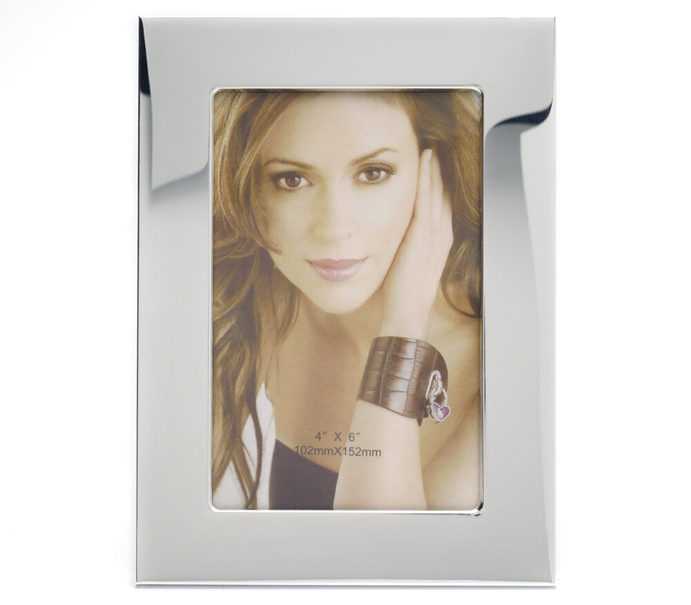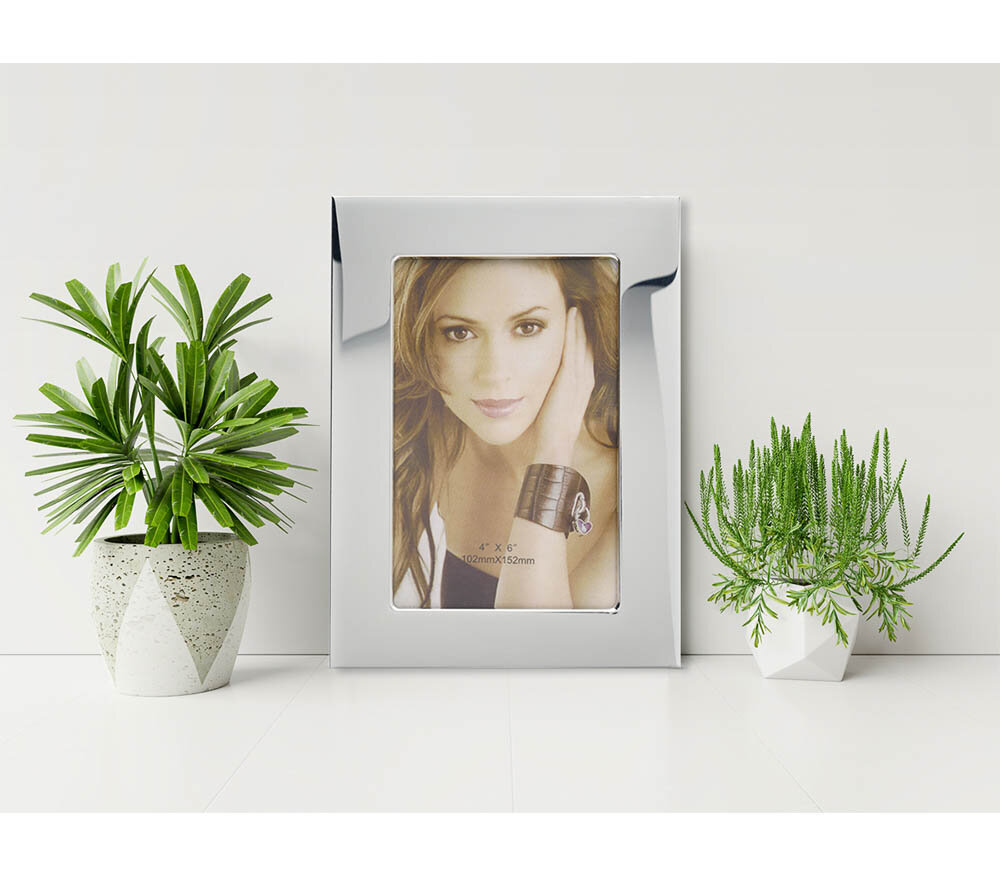 Металлическая фоторамка в широком гладком багете серого цвета для фотографий формата 10х15 см. Сзади имеется специальная ножка для возможности установки на горизонтальную поверхность.