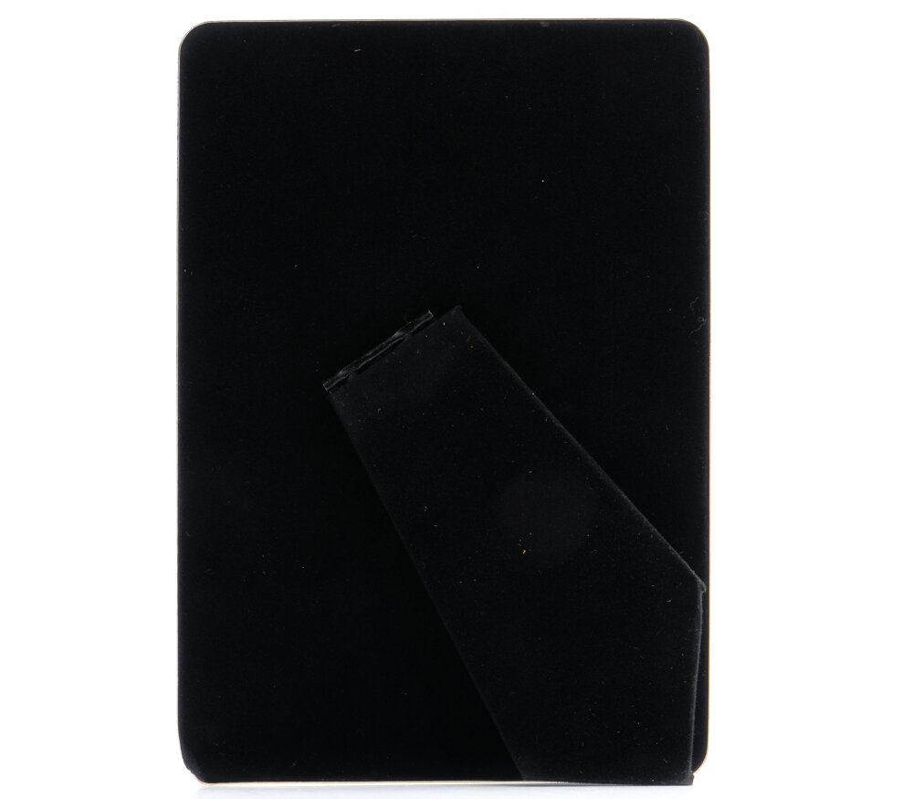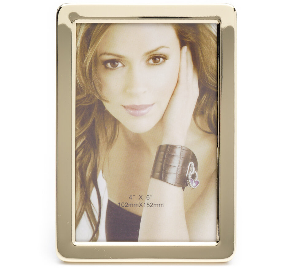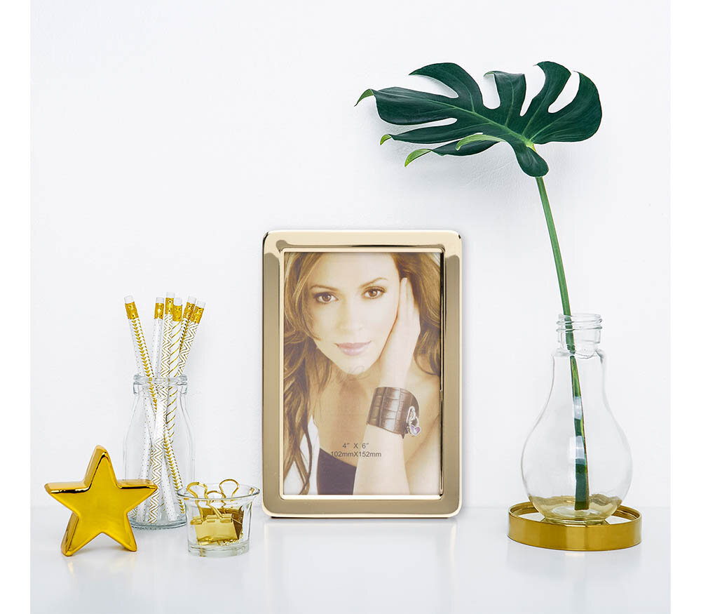 Стильная металлическая фоторамка золотого цвета с закругленными краями для фотографий формата 10х15 см. Сзади имеется ножка-подставка для установки на горизонтальную поверхность.