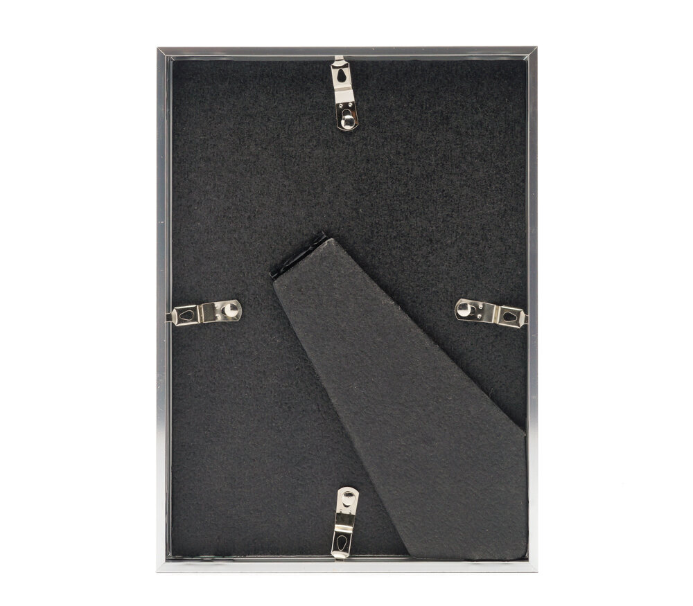 Металлическая рамка серебряного цвета для фотографий размером 15х20 см. Внутренняя вставка позволяет использовать ее в качестве паспарту для фотографий формата 10х15 см. Рамка имеет ножку-подставку для размещения на горизонтальных поверхностях и настенное крепление.