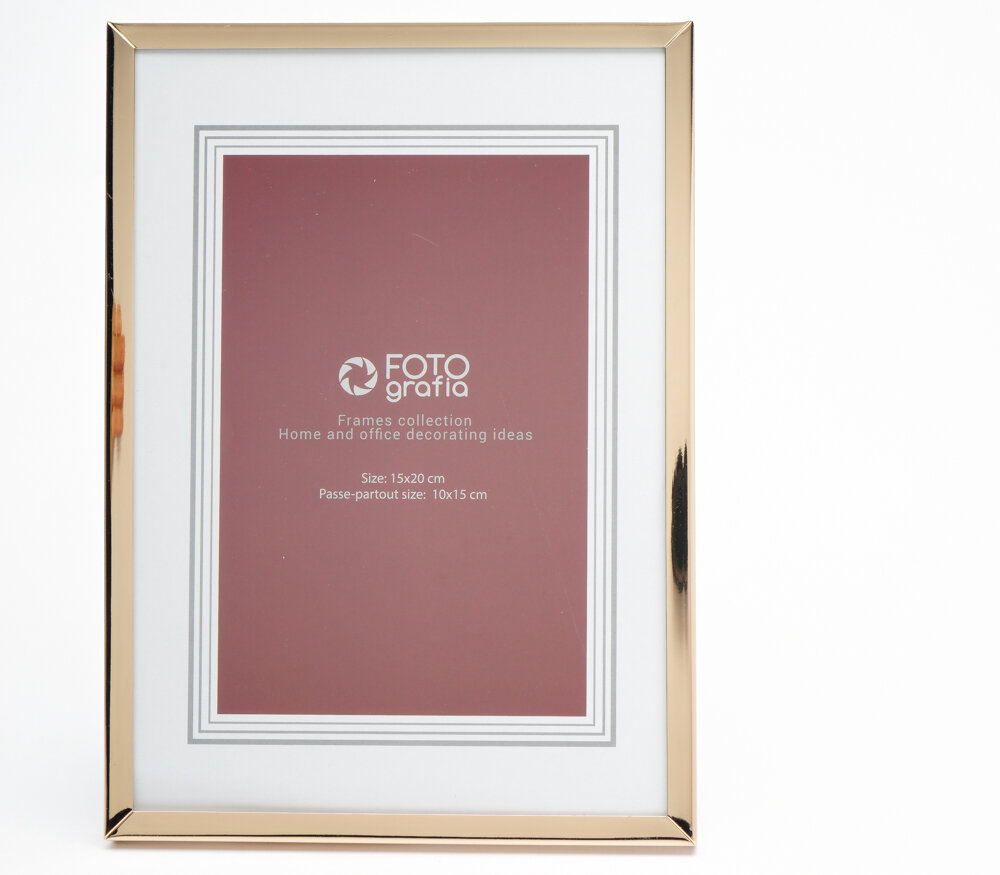 Металлическая рамка золотого цвета для фотографий размером 15х20 см. Рамка имеет ножку-подставку для размещения на горизонтальных поверхностях и настенное крепление.