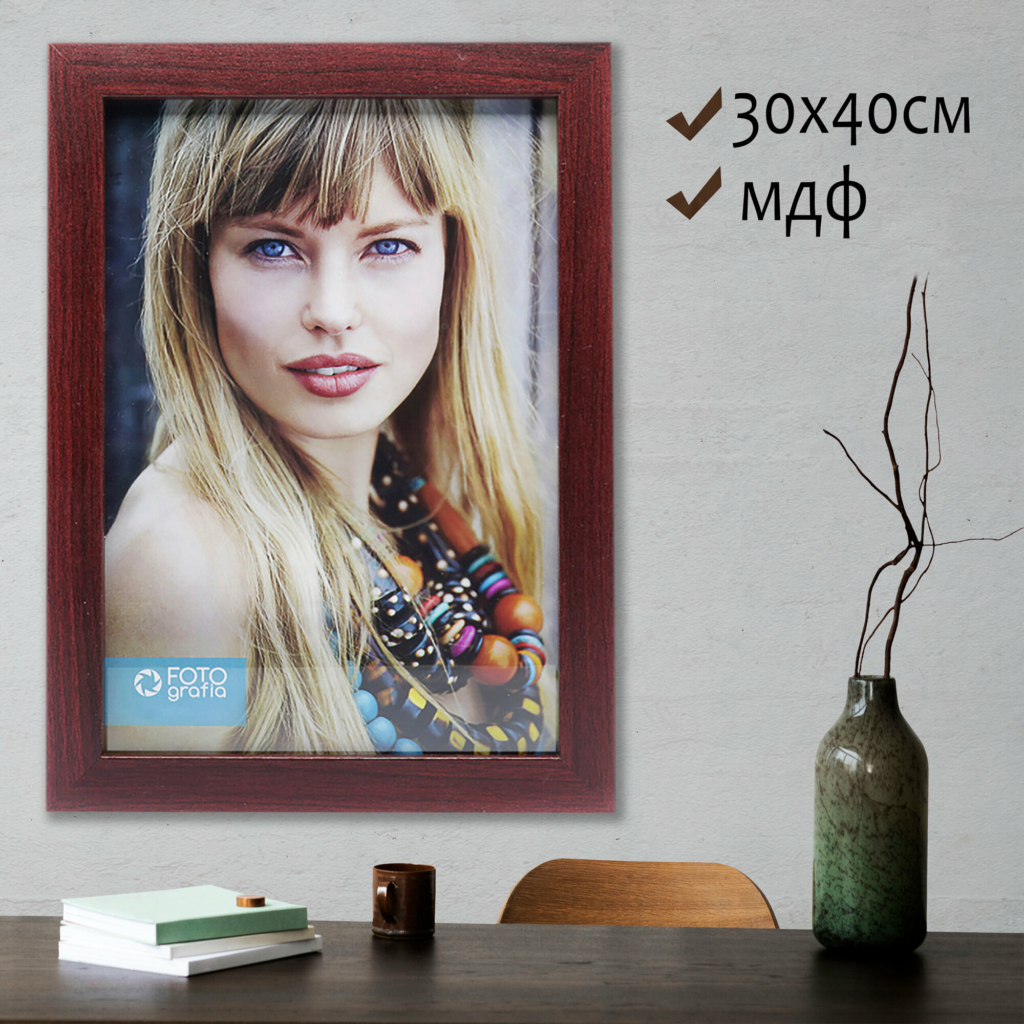 Фоторамка форматом 30 х 40 см, выполнена из МДФ и имеет защитное стекло. Сзади имеются два крепления для вертикального подвеса. Ножки-подставки нет.Фоторамки, выполненные из древесноволокнистой плиты (МДФ), отличаются меньшим весом по сравнению с аналогами из цельной древесины. Материал экологически безопасен и не выделяет никаких запахов. Производство: Китай