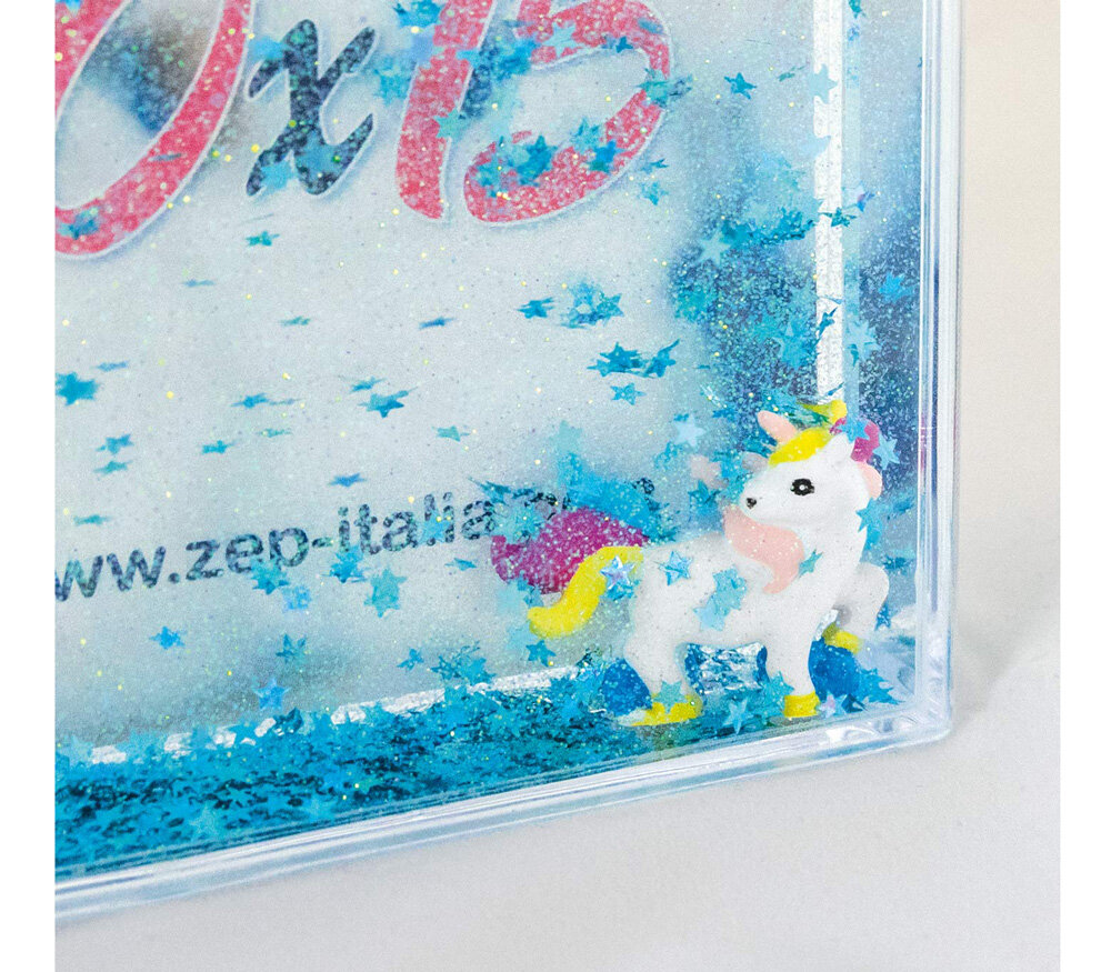 Рамка ZEP Shake Frame Unicorn для фотографии формата 10х15 см. Выполнена из прозрачного пластика (акрила) с наполнением из голубых блесток в форме звездочек, которые плавают в жидкости (как в «шаре со снежинками»), фигурка единорога фиксированная. Отлично подходит для подростков и молодых девушек. Рамка ставится на стол или другую ровную поверхность. Поставляется в картонной коробке.