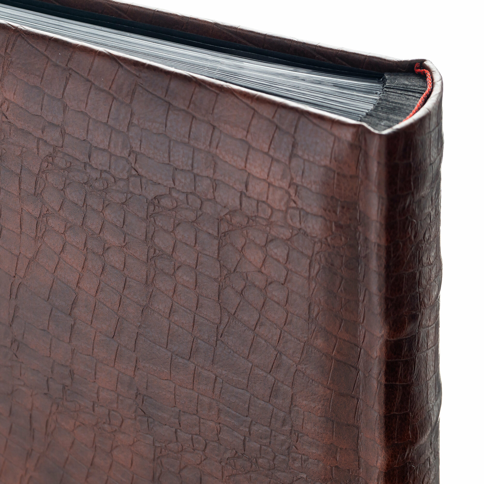 500 фото 10х15см, книжный переплет, бумажные листы чёрного цвета с прозрачными кармашками, 5 фото на странице, обложка из эко-кожи с имитацией кожи крокодила, возможность разместить свои фото на обложке.