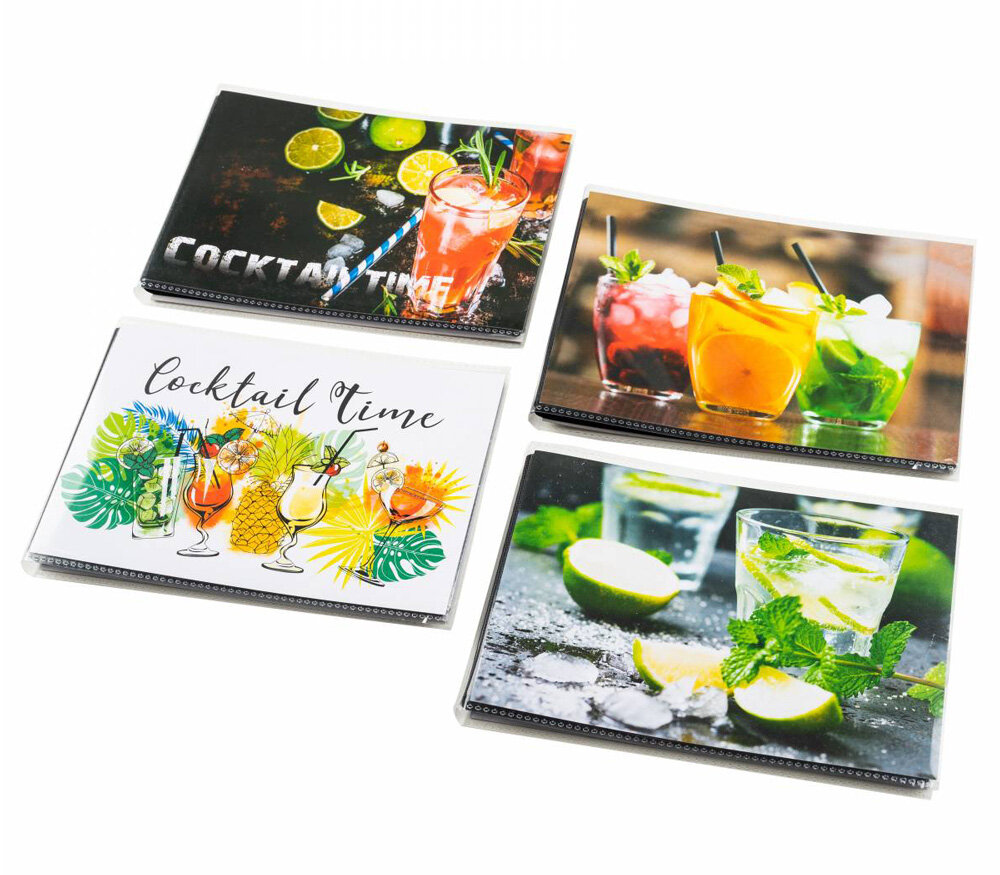 Мини-альбом на 40 фотографий формата 10х15 см. Обложка с изображениями коктейлей со льдом – картонный лист в пластиковом кармане, несколько вариантов в ассортименте, лист можно извлечь и заменить на личное фото или картинку. Страницы выполнены из пластика.
