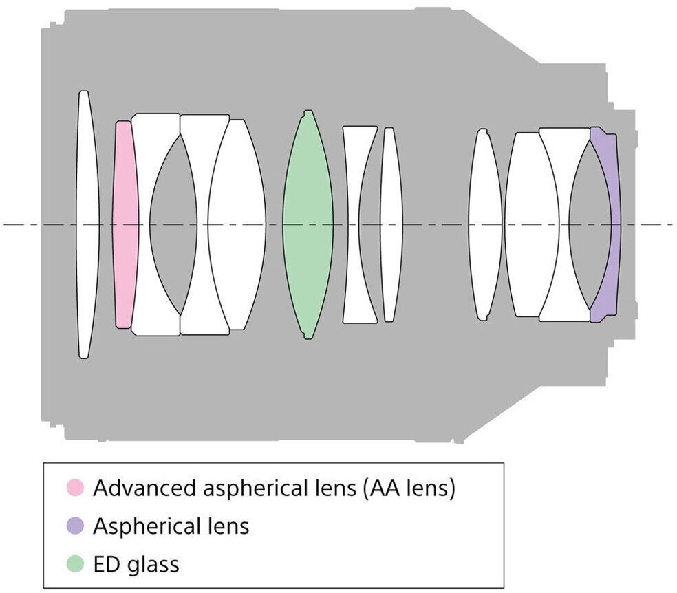 | Конструкция объектива | 12 элементов в 9 группах (1 асферический, 1 "продвинутый" асферический AA, 1 из стекла со сверхнизким коэффициентом рассеивания) |