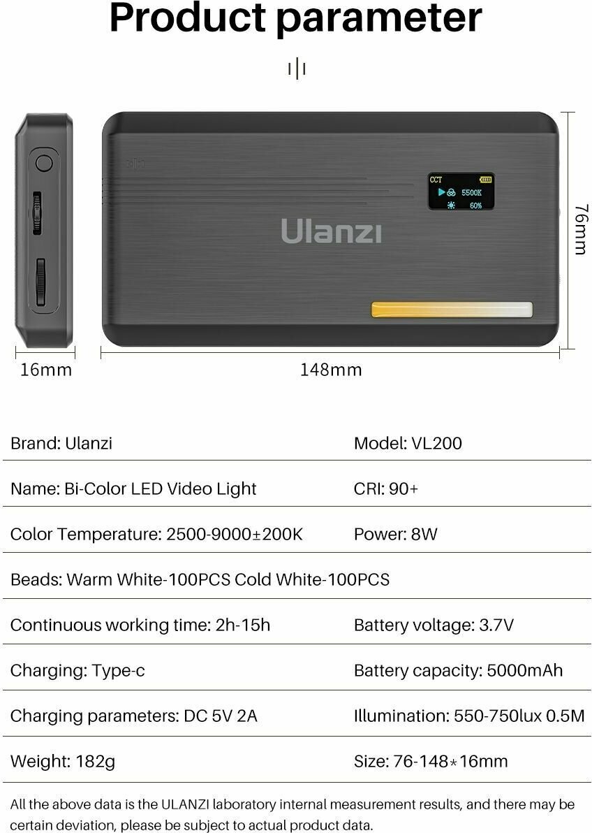 Светодиодный осветитель Ulanzi VL200 Bi-color, 8 Вт, 2500-9000 K, аккумулятор