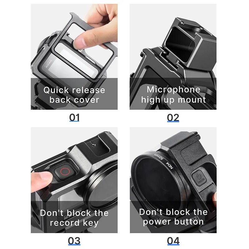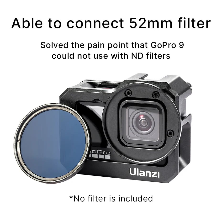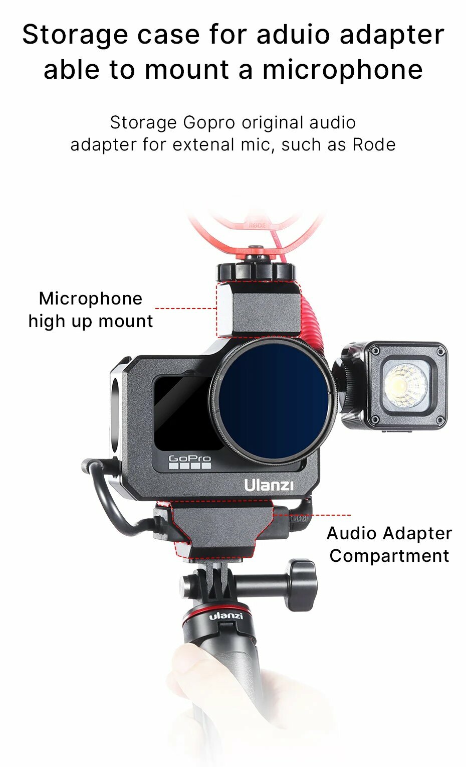 Влог рамка для камеры – лучшее решение в ситуациях, когда на один монопод или штатив необходимо установить экшн-камеру, микрофон с адаптерами, фильтры и свет. Клетка из качественного алюминия практически полностью заменяет аксессуар расширения для GoPro HERO 9 / 10 / 11.Клетка одновременно обеспечивает качественную защиту камере и создает идеальные условия для поддержания работоспособности оборудования без дополнительных временных затрат и физических усилий. Отсутствие дверцы у рамки позволяет без проблем пользоваться разъемом Type-C и при необходимости быстро менять аккумулятор, не вынимая камеру из рамки.Размер клетки Ulanzi G9-5 полностью соответствует параметрам экшн-камеры GoPro Hero 9, что обеспечивает надежную фиксацию камеры, исключает вероятность повреждения оборудования. Клетка изготовлена из высокопрочного легкого алюминия с хорошей теплопроводностью. Это исключает перегрев камеры в случае продолжительной эксплуатации.Наличие крепления для стандартных круглых фильтров диаметром 52 мм, минисветодиодов и микрофона значительно повышает комфортность во время работы. Продуманная конструкция приспособления позволяет легко манипулировать кнопками переключения и записи. Благодаря увеличенной высоте крепления «холодный башмак» вероятность попадания микрофона в объектив GoPro Hero 9 исключена. Приспособление укомплектовано также колпачком для объектива и креплением для адаптера микрофона.