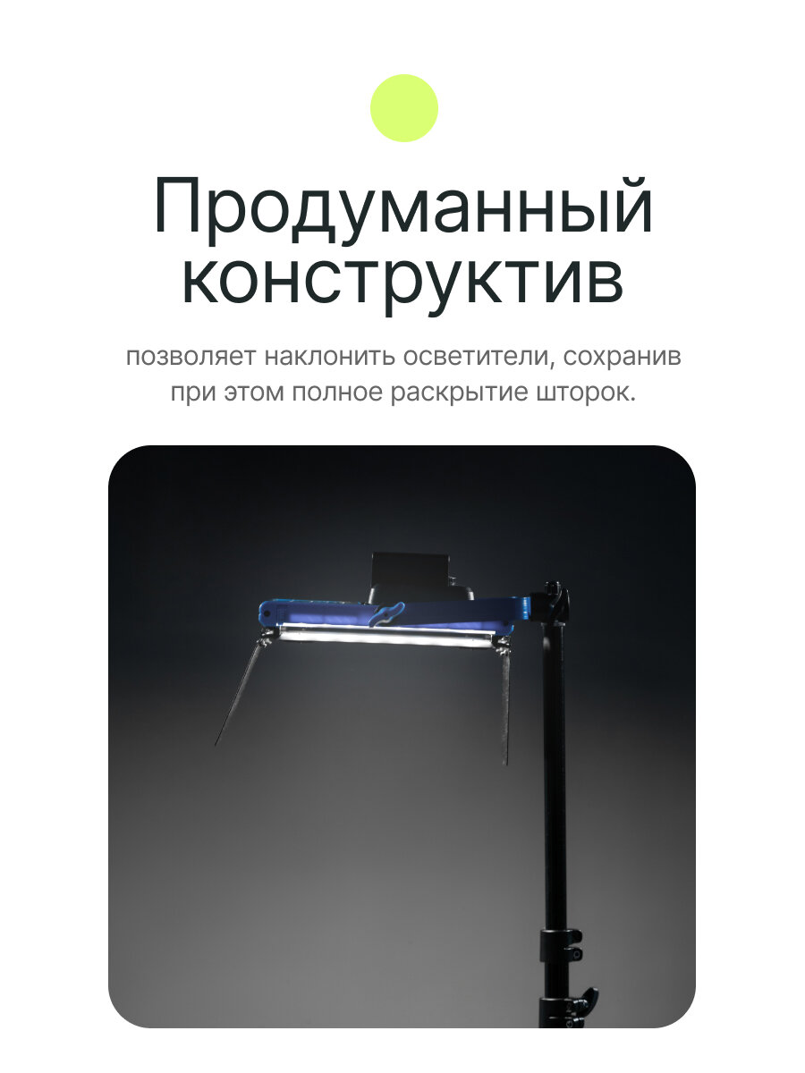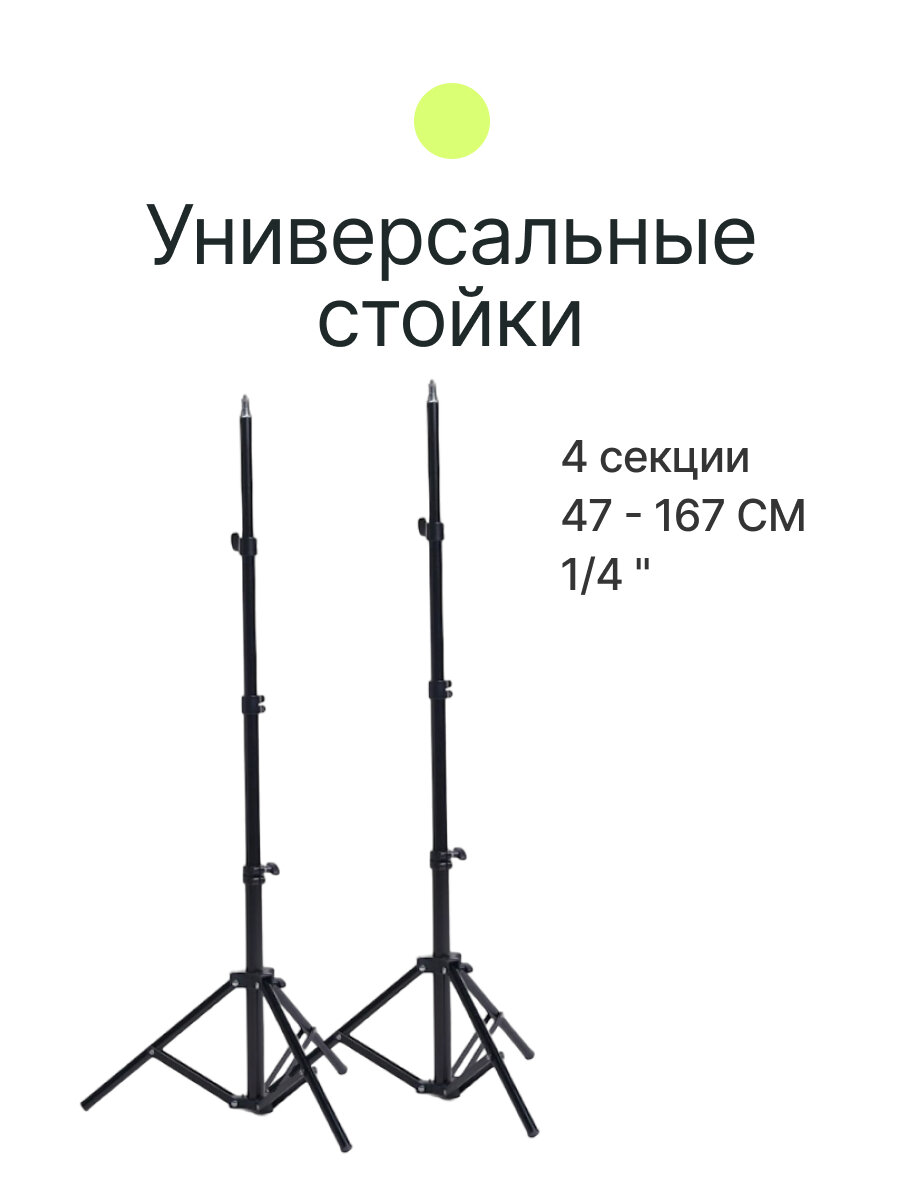 | Комплектация | осветители - 2 шт, адаптер питания DC 17B / 2.8A - 2 шт, стойка - 2 шт, сумочка для переноски и хранения |