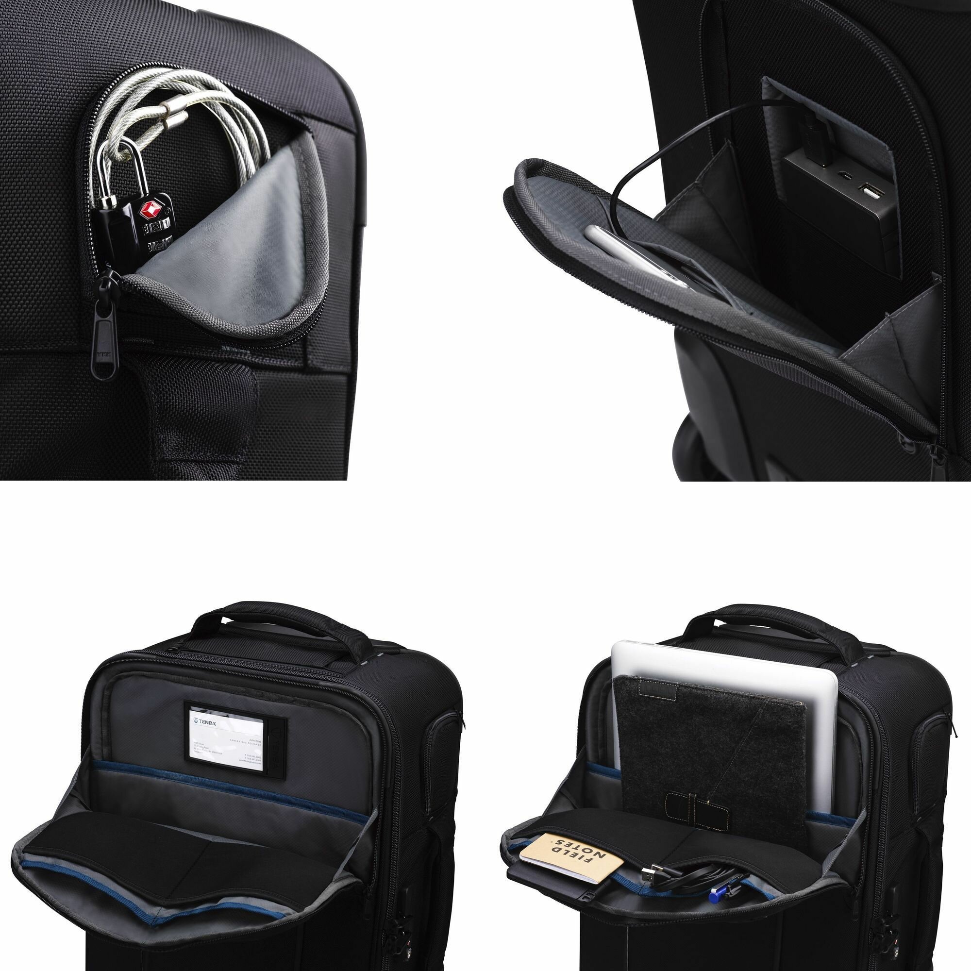 Встроенный кодовый замок TSA, защищает молнию основного отсека. Чтобы прикрепить сумку к неподвижному объекту, такому как столб, в комплект входит стальной плетеный трос с навесным кодовым замком TSA. Для хранения троса и замка предусмотрен небольшой наружный карман на молнии.
