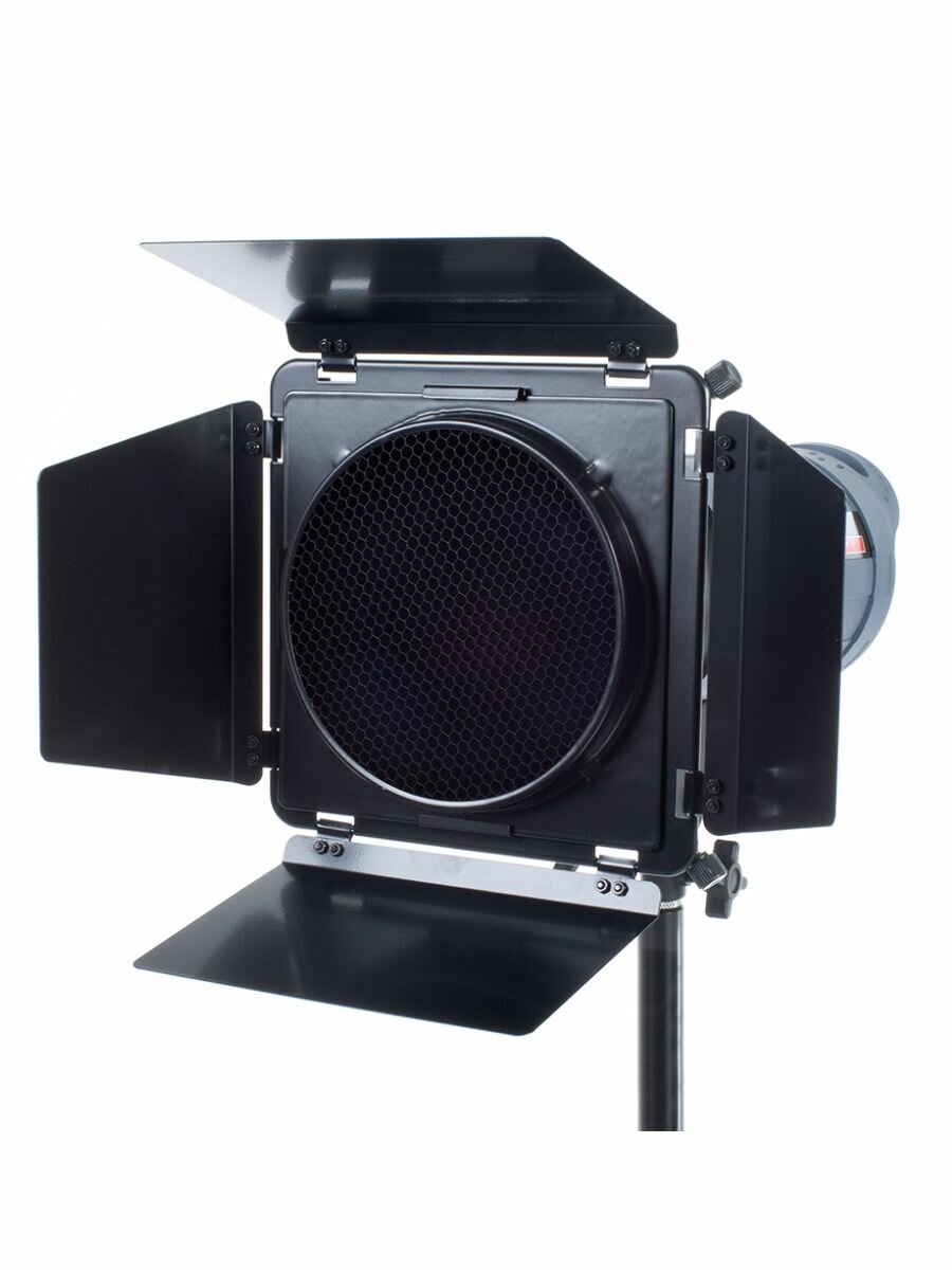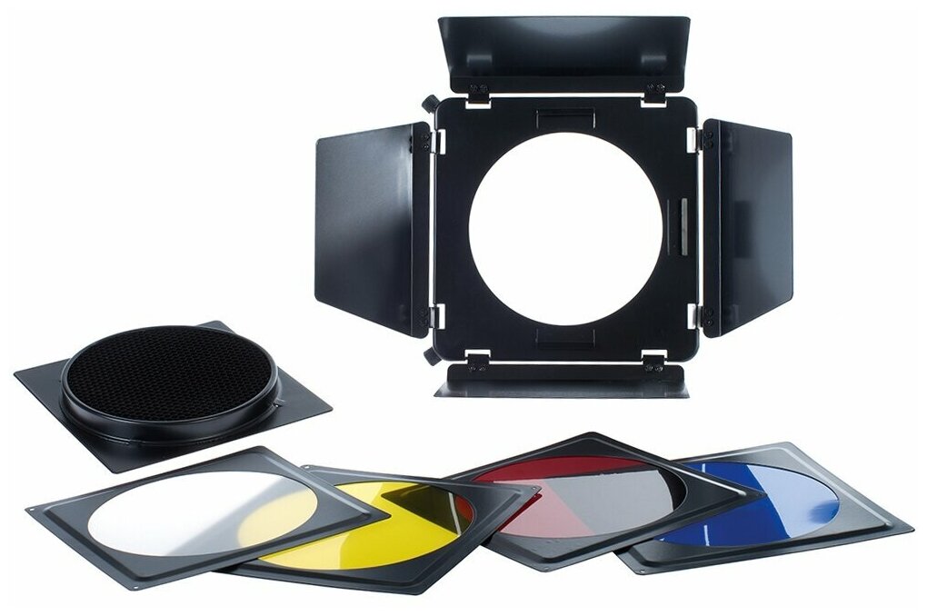 Falcon Eyes DEA-BHC – универсальный набор, включающий четырехлепестковые шторки и соты с цветными фолиевыми фильтрами. Цвета фильтров: жёлтый, красный, синий и белый рассеивающий. Данный набор устанавливается на любой рефлектор диаметром от 180 до 220 мм. Шторки ограничивают световой поток и позволяют настроить освещение в соответствии с требованиями фотографа. Изготовлены из металла, крепление шторок производится с помощью двух винтов по углам.