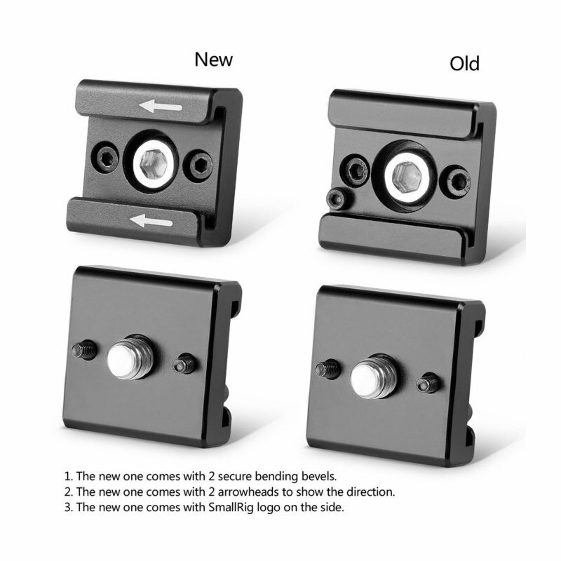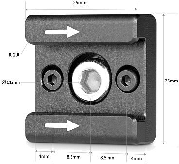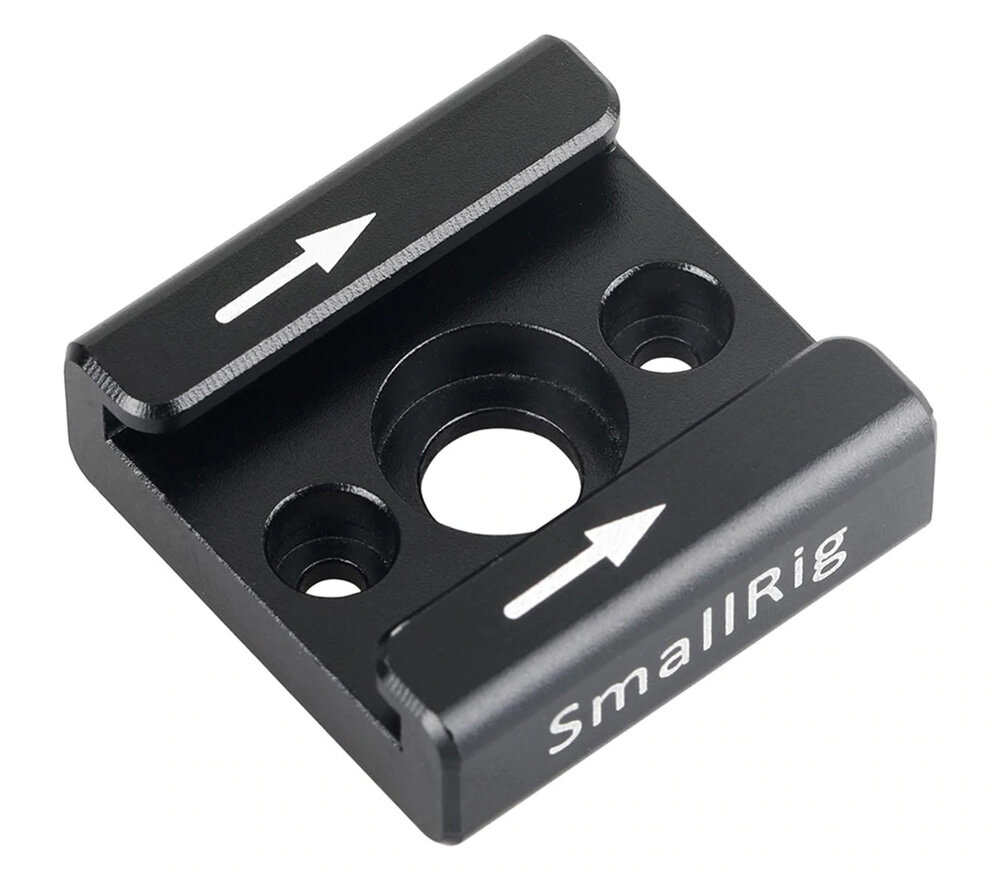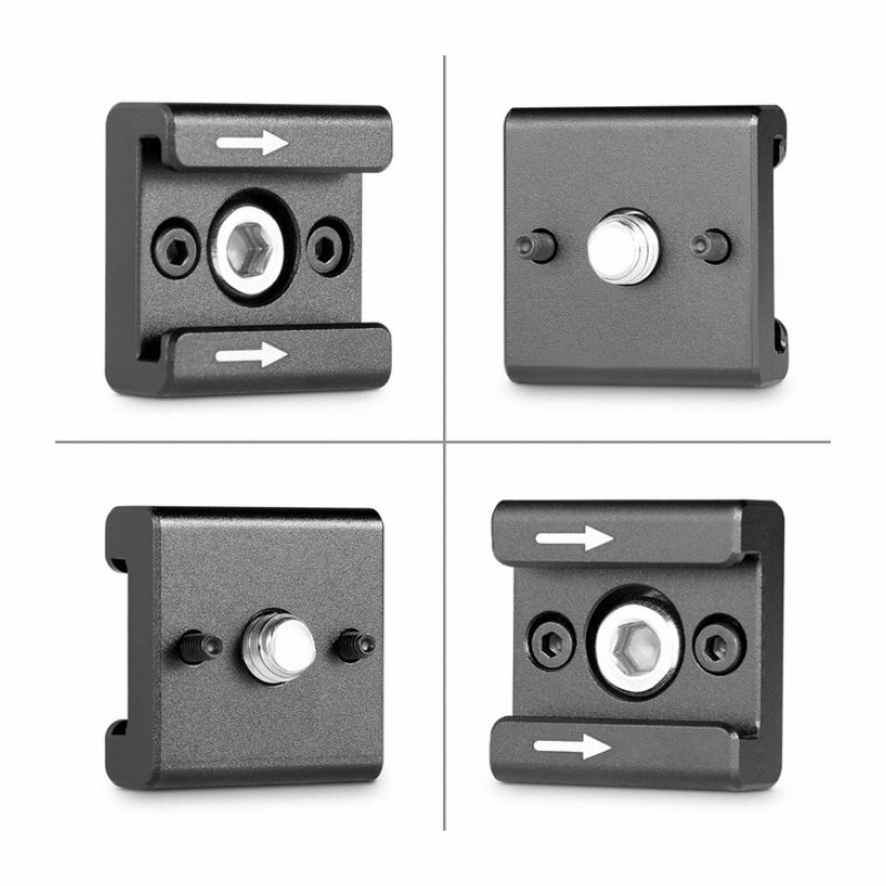 Адаптер типа «холодный башмак», устанавливается на винт 1/4"-20 + 2 винта М2.5 (в комплекте), которые предотвращают произвольное вращение адаптера и страхуют при ослаблении основного винта. Стрелки показывают направление, в котором заводится аксессуар. В комплекте 2 штуки.