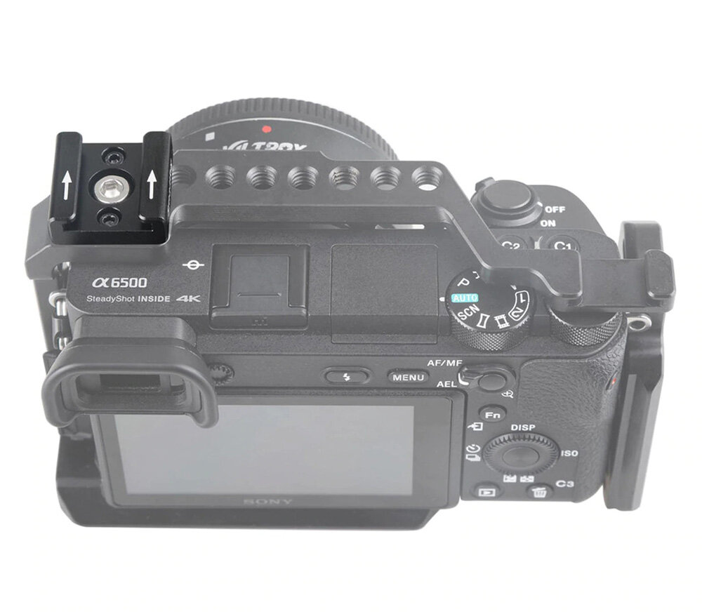 Крепление типа холодный башмак для установки съёмочного оборудования с аналогичным креплением. Приспособление может быть прикреплено с помощью винта 1/4". Входная сторона отмечена стрелками. С противоположной стороны имеется блок, не позволяющий установленным устройствам пройти насквозь.