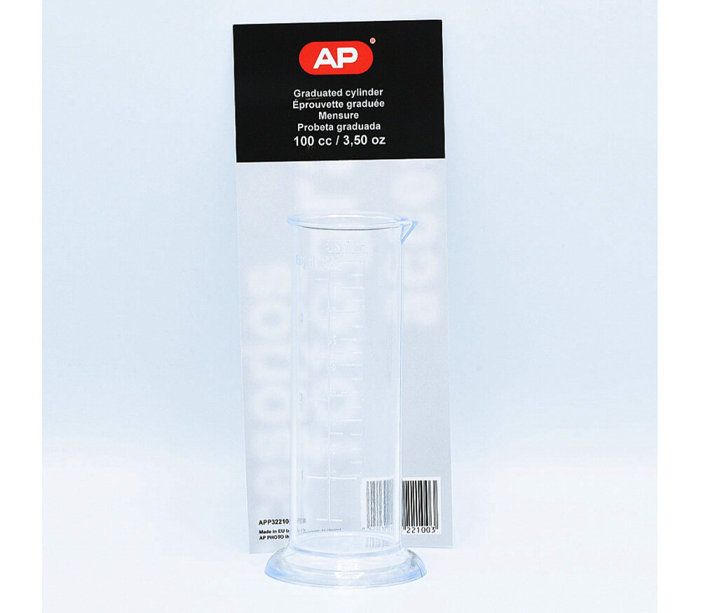 Мерный стакан (мензурка) емкостью с рисками по 5 мл, также присутствуют отметки в английских и американских унциях. Прозрачный пластик, устойчивый к фотографическим реагентам и высокой температуре (до 80° С).
