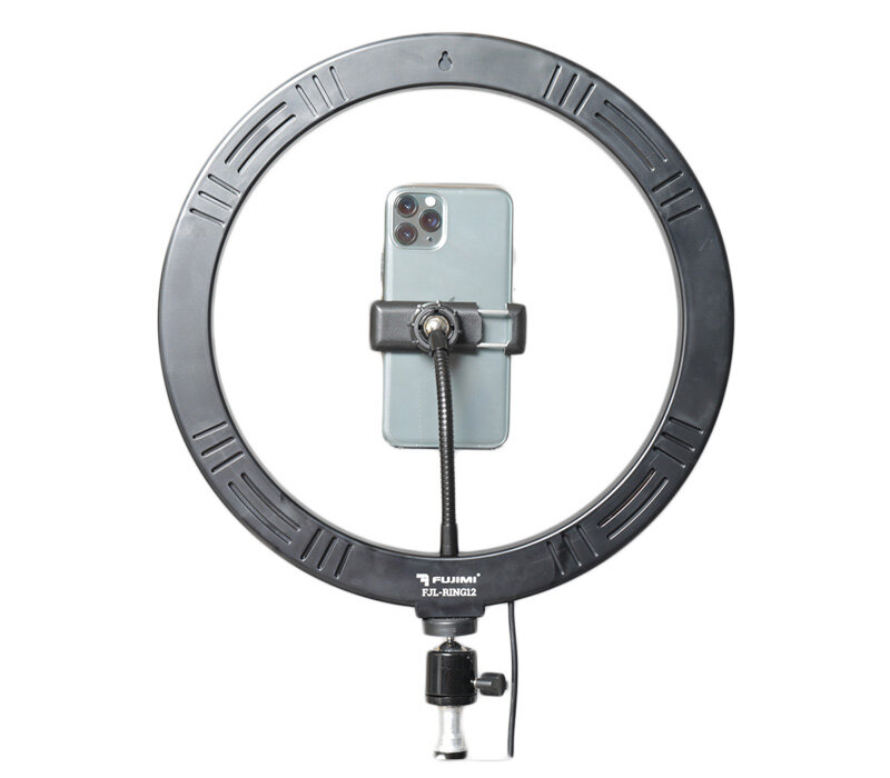 Профессиональный 12-ти дюймовый кольцевой осветитель со 162 мощными светодиодами и питанием от USB. Fujimi FJL-RING12 сконструирован для работы с современными смартфонами в ландшафтном или портретном режиме съемки. Оснащен 81-им светодиодом холодного света и 81-им светодиодом теплого света, что позволяет регулировать температуру от 3000К до 6000К и интенсивность освещения от 10% до 100%. В набор входит 4-х секционная стойка с малой шаровой головой для установки идеального угла освещения. Также осветитель оснащен универсальным крепление для смартфона с возможностью установки как в горизонтальном так и вертикальном(портретном) режиме съемки.