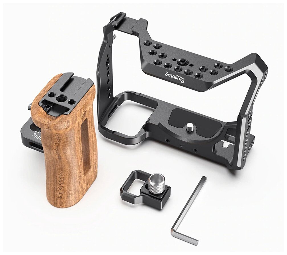 Выгодный комплект SmallRig 3008 для Sony A7S III: клетка 2999, боковая деревянная ручка и фиксатор для кабеля. Прочная клетка для камеры Sony A7S III, выточенная из цельного бруска алюминия. Множество резьбовых гнезд 1/4"-20, 3/8"-16 и Arri 3/8”, холодный башмак (сверху) и планка НАТО (слева) позволяют установить всё разнообразие дополнительных аксессуаров, в том числе: верхние и боковые ручки, мониторы, рекордеры, микрофоны, лампы постоянного света, фиксаторы для кабелей и 15-мм направляющие. Предусмотрены проушины для ремня, в том числе кистевого. Клетка предоставляет свободный доступ к батарее, карте памяти, всем интерфейсам и органам управления. Вес клетки составляет всего 220 г.