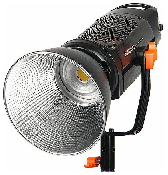Осветитель оснащен металлическим байонетом Bowens, который подходит для большого количества различных светомодифицирующих насадок: софтбоксов, рефлекторов, портретных тарелок и т.д. В комплект входит стандартный рефлектор Ø185 мм параболической формы с фактурной серебристой внутренней поверхностью. Совместное использование осветителя и параболического рефлектора создает яркий направленный пучок света с очерченными краями.