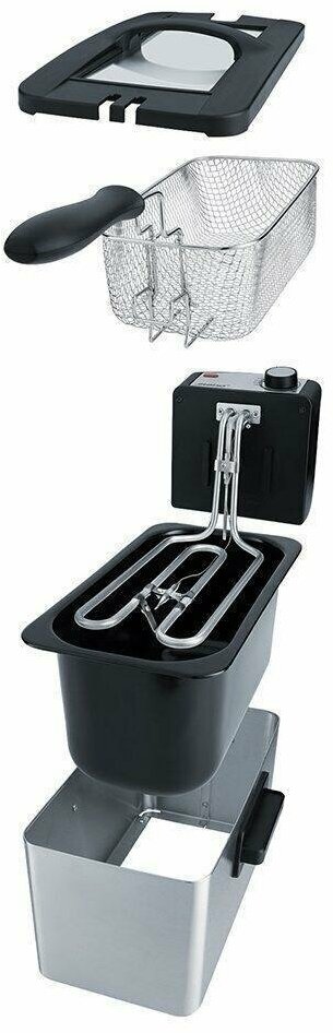 Фритюрница. Корпус из нержавеющей стали. Полностью разборная. Съемный резервуар для масла. Максимальный вес продуктов — 600 гр. Профессиональная инновационная система прогрева. Крышка с большим окошком.