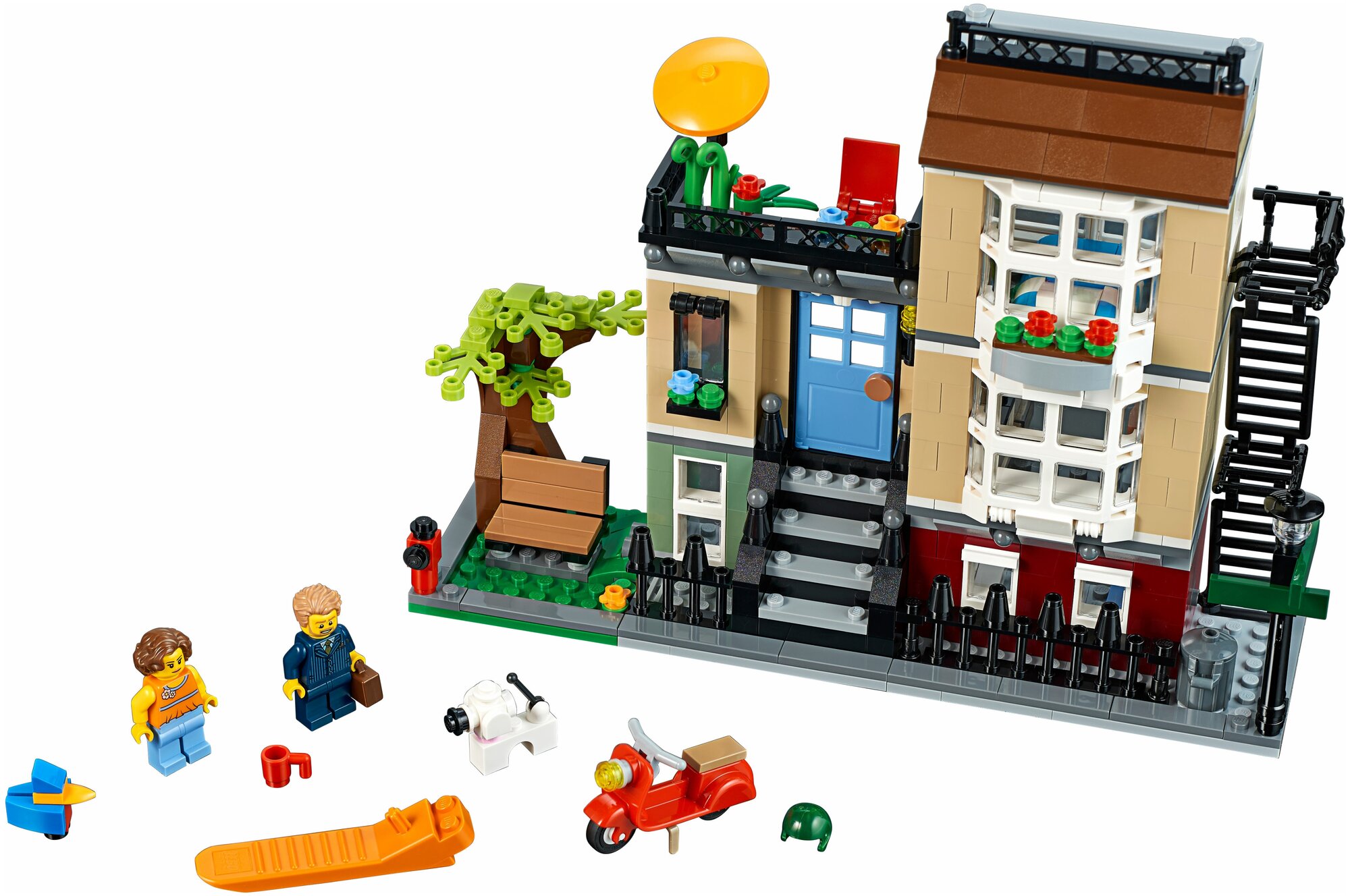 LEGO Creator Домик в пригороде - набор, который сможет заинтересовать юного исследователя. Ему предстоит отправиться в гости к очаровательной паре, которая предпочитает тихую и размеренную жизнь в пригороде. Их дом обставлен с любовью: за стенами трехуровневого таунхауса расположена уютная гостиная с плоским экраном и диванчиком, а для особого тепла и комфорта стоит отправиться к камину. Если голод дает о себе знать, то наверняка вкусные и ароматные запахи приведут на кухню, а после насыщенного дня следует подняться по лесенке в спальню. Перед сном нужно не лениться и заглянуть на балкон, поскольку с его высоты открывается чарующий вид на город: закатные лучики «танцуют» с зеленой листвой парковых деревьев, радуя всех окружающих своим светом. Для смены обстановки набор с легкостью перестраивается в городское кафе или пригородный дом с теплицей.