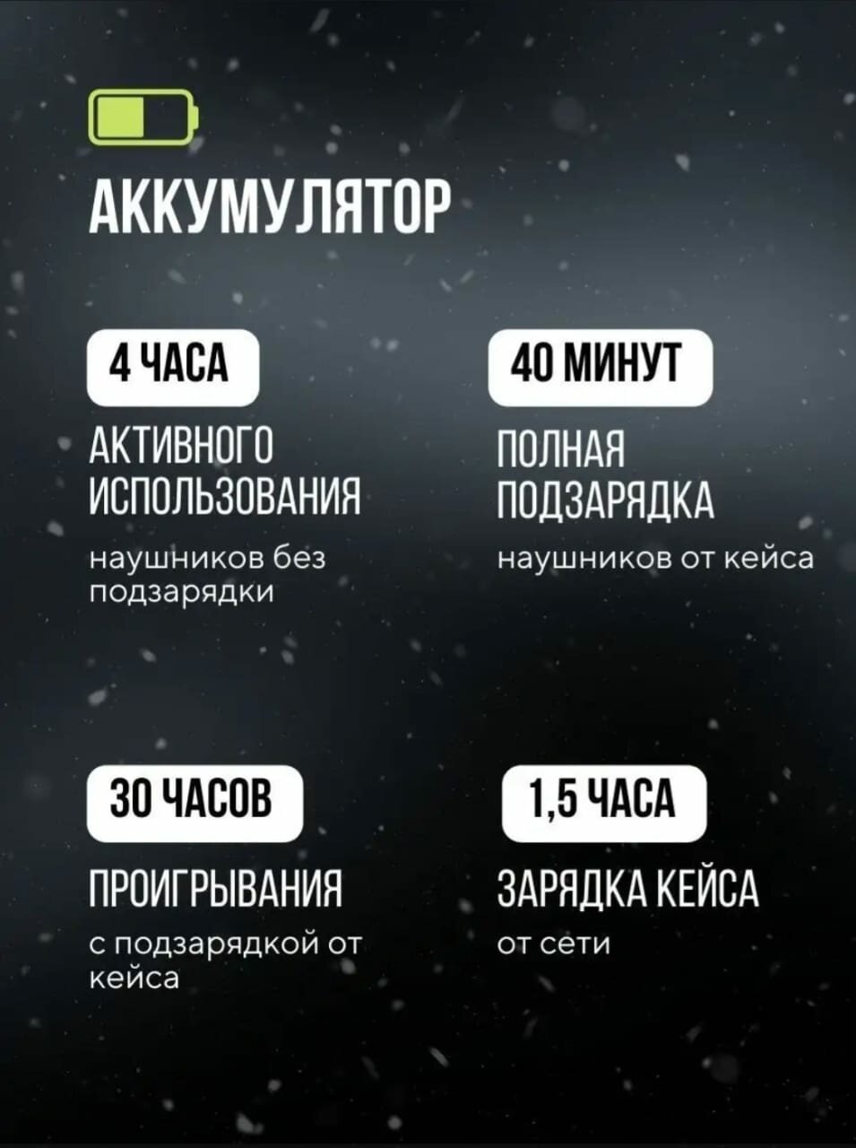 | Дополнительная информация | Быстрая зарядка. Размеры наушника: 40.5 х 18 х 16.5 мм. Вес одного наушника 8 г. Акселерометр. |