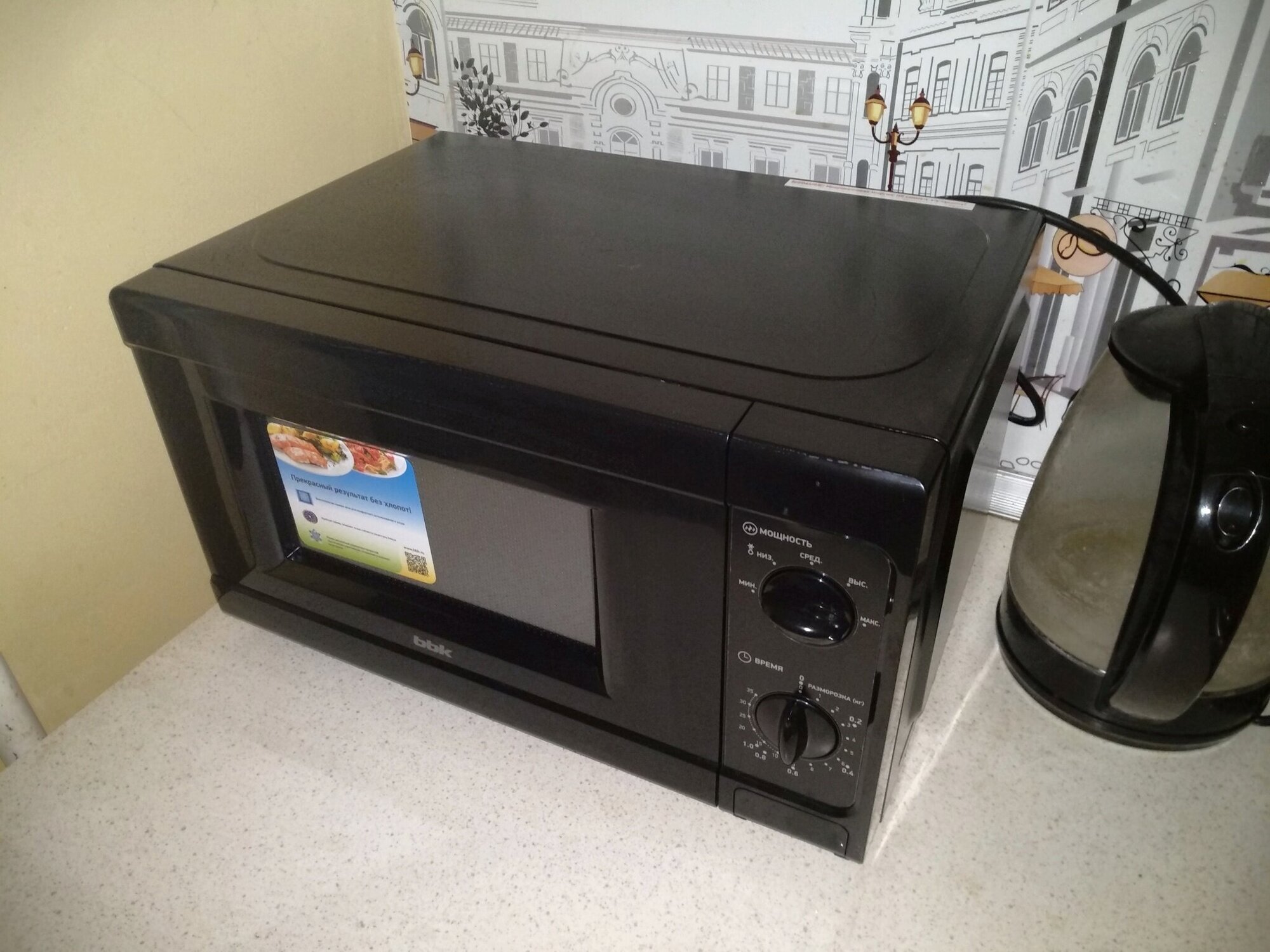 - Микроволновка, благодаря чёрному цвету, стильно выглядит. По размерам компактная, но при этом для любых блюд места вполне хватает. Быстро разогревает пищу. Нет лишних функций, простое механическое управление.