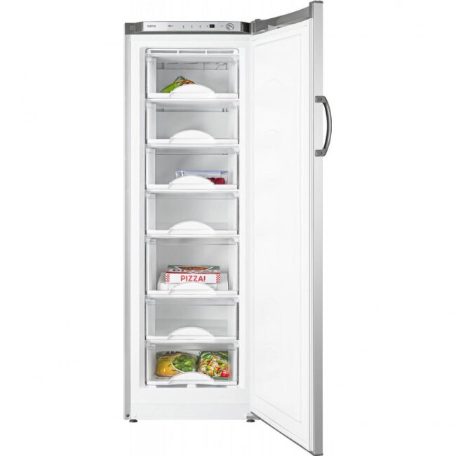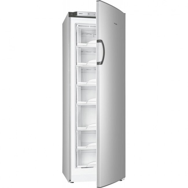 В качестве хладагента в морозильном шкафу ATLANT M используется изобутан (R600a), который имеет высокий холодильный коэффициент, что позволяет уменьшить энергопотребление. Объем внутренней камеры составляет 243 л, а само пространство разделено на 7 секций с выдвижными ящиками из пластика. Также в комплект входит форма для приготовления льда.