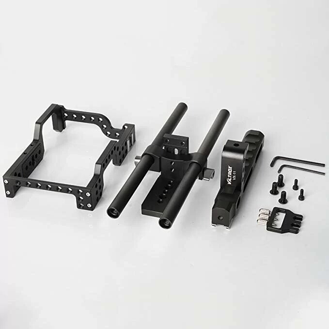 Клетка Viltrox VX-11 отличается от аналогов своей универсальностью, что позволяет использовать её с большим количеством камер типа Sony A7, A6, Panasonic GH4/5 и прочими, со схожими габаритами Матричный вид позволяет закреплять дополнительное оборудование по периметру в любую из множества сот с резьбой 1/4 или 3/8 дюйма, а так же на холодный башмак, расположенный на рукоятке Фиксатор проводов позволит надежно зафиксировать соответсвующий кабель на входе в камеру, предотвратив нежелательный дисконект или повреждение портов камеры Также в комплекте прилагаются направляющие длиной 300 мм и универсальное базовое крепление к ним. Все элементы изготовлены из авиационного алюминия, прочного и надежного, но легкого, что весьма важно при продолжительной работе с большим количеством оборудования Комплектация: клетка верхняя рукоятка базовая площадказажим для кабелей направляющая 15мм (2шт) винт (5шт) набор ключей