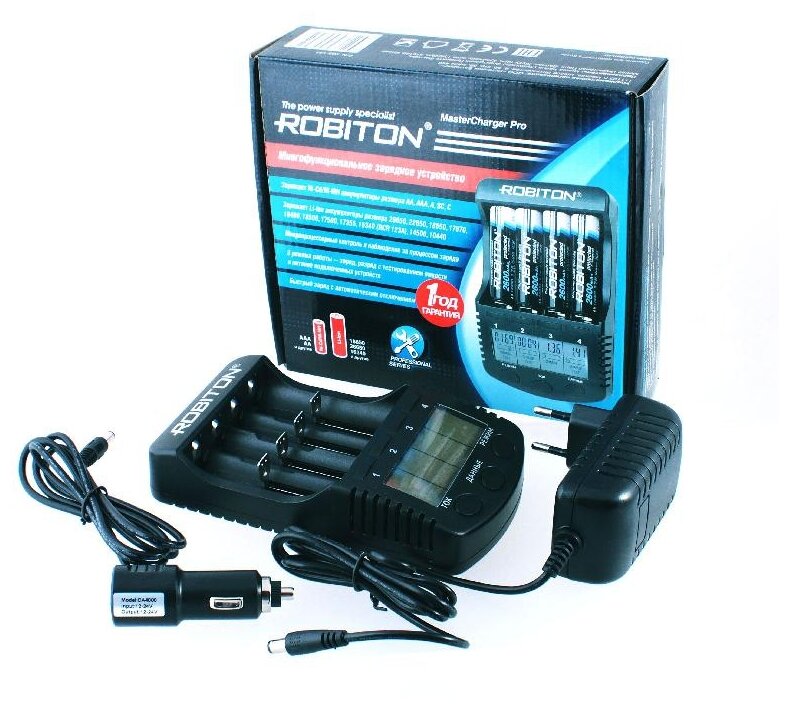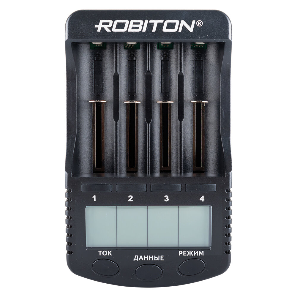 ROBITON – интеллектуальное многофункциональное автоматическое зарядное устройство, заряжающее аккумуляторы нескольких химических систем: никель-кадмиевые (Ni-Cd), никель-металлогидридные (Ni-MH) и литий-ионные (Li-ion) с напряжением 3.6 - 3.7В. Данная модель имеет 3 режима работы: заряд, разряд с тестированием емкости аккумуляторов и питание подключенных устройств через встроенный USB-порт, а также позволяет выбирать величину зарядного тока (300, 500, 700 или 1000мА) для каждого заряжаемого аккумулятора. Жидкокристаллический дисплей показывает детальную информацию по каждому аккумулятору: ток заряда в мА, прошедшее время в часах и минутах, напряжение в вольтах, накопленная емкость в мАч или Ач и внутреннее сопротивление аккумулятора в мОм.