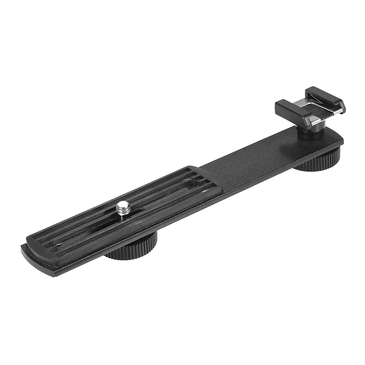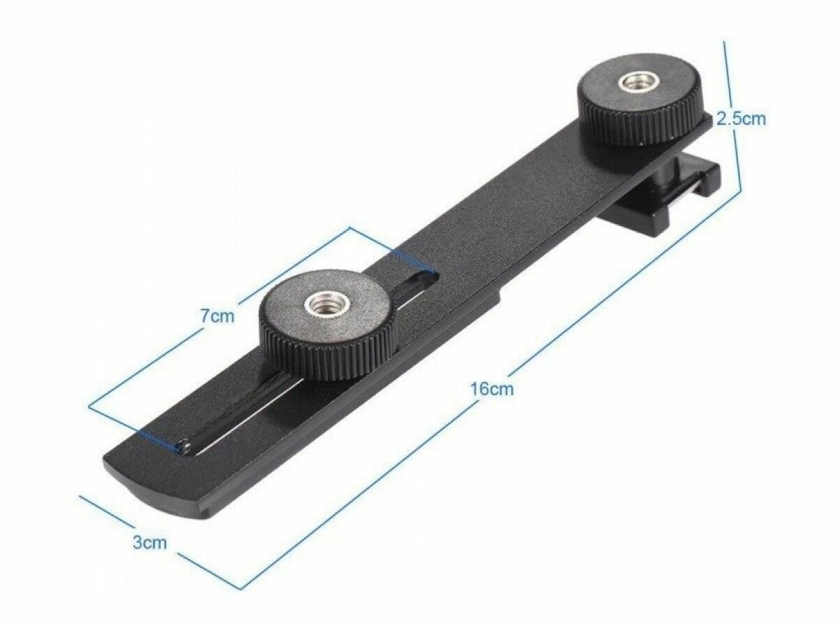 Универсальное крепление-планка с болтом 1/4 и держателем Прямой кронштейн имеет сдвижной 1/4' винт. Позволяет перемещать микрофон или другие аксессуары относительно камеры. Подходит для всех DSLR и видео камер и имеет гнездо для штатива.
