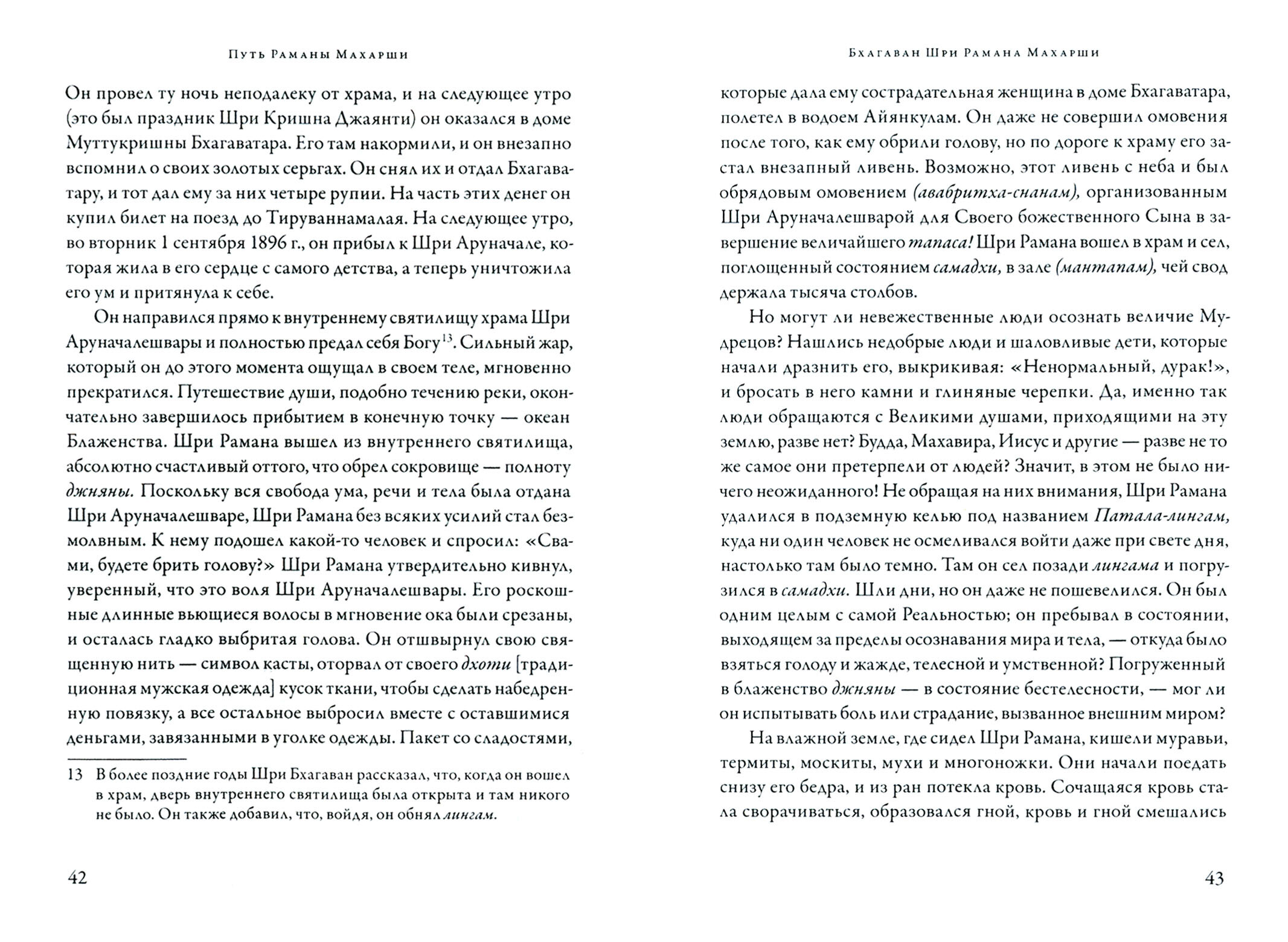 Садху Ом - один из самых выдающихся учеников Раманы МахаршН, наиболее известного и почитаемого учителя адвайты (недвойственности). Эта книга представляет собой исчерпывающее изложение путей Самоисследования и Бхакти (Любви), предлагаемых Раманой Махарши, а также разъяснения его наставлений, касающихся Бога, мира и кармы. Но это не просто пересказ всем известных идей, которые уже есть в других книгах. В ней содержится множество наставлений Раманы Махарши, расположенных в логическом порядке, а также новые и оригинальные изложения многих идей, которые в других книгах упоминаются лишь вскользь. Такая свежесть и оригинальность изложения стала возможной только благодаря тому, что автор сам прошел тот путь, который указал Рамана Махарши, и познал на собственном опыте цель этого пути. В книгу также вошли точный перевод Садху Ома с тамильского языка работы Раманы Махарши "Кто я?" и переводы отдельных строф "Ул- ладу Нарпаду" с его комментариями.