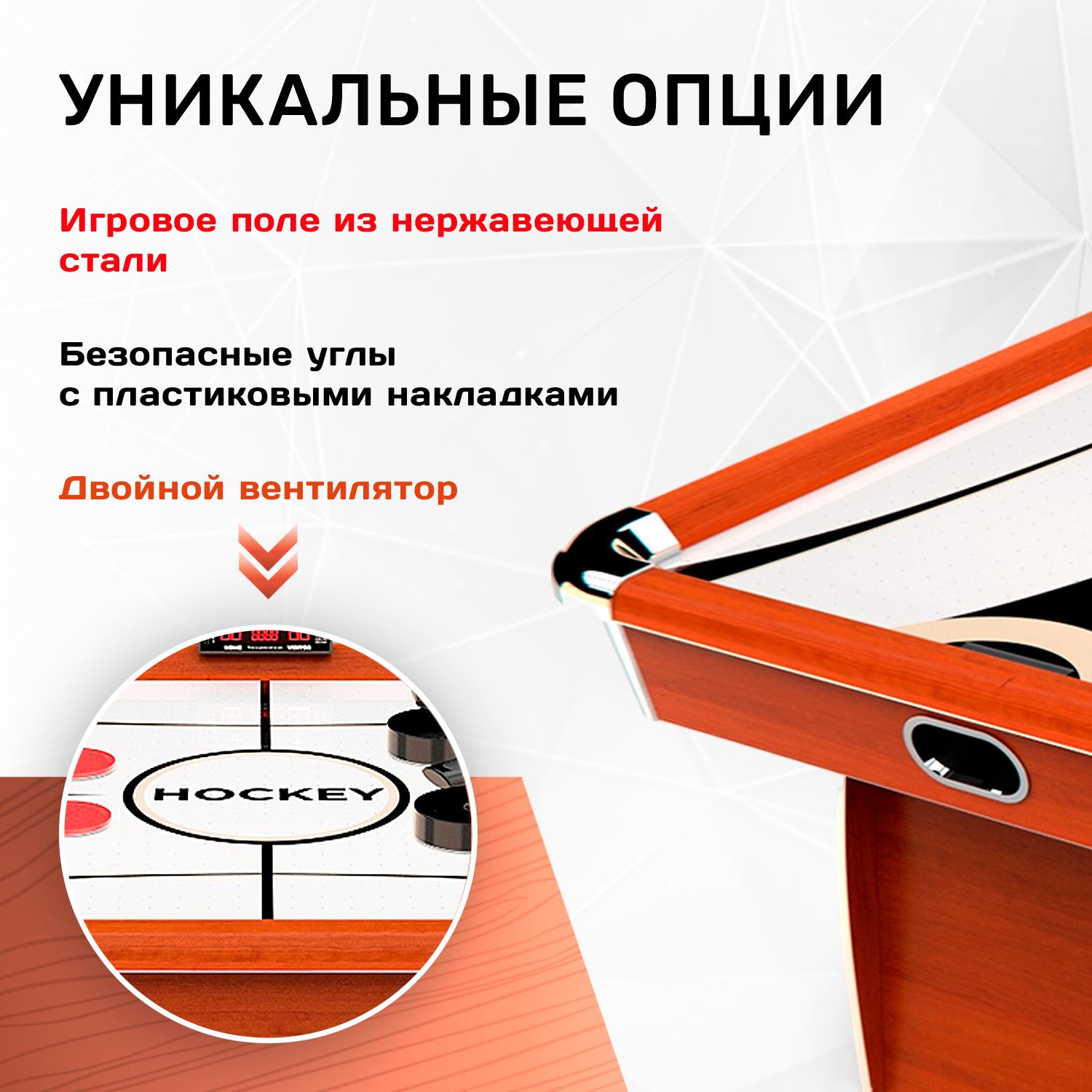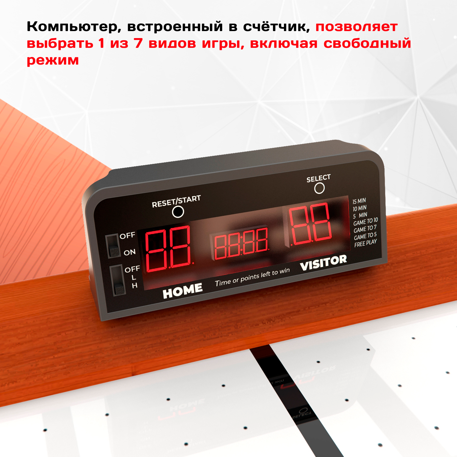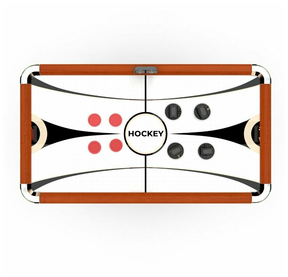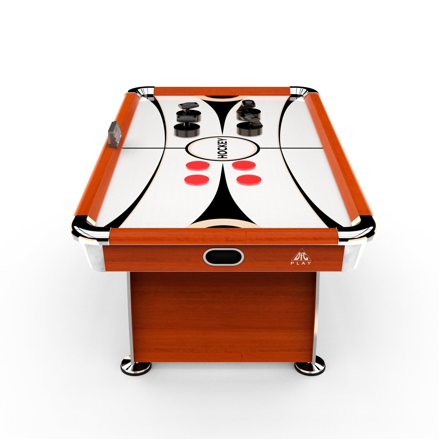 Игровой стол – аэрохоккей DFC AT-350 модель для домашнего использования размером 90 дюймов. В комплекте 4 биты и 4 шайбы, а также электронный счётчик очков. Стол имеет компенсаторы неровности пола. Бортики по краям поля тёмно-вишневого цвета из МДФ с ПВХ покрытием, изнутри со стороны поля – из АБС-пластика. Размеры бортиков составляют 9 х 3,8 см, хромированные пластиковые уголки - толщиной 3,8 см. Боковые стороны сделаны, как и бортики, из МДФ вишнёвого цвета, их размер составляет 17 х 1,6 см, верх и низ, а также углы по краям с хромированной отделкой. Ножки из МДФ 2,5 см по краям отделаны хромом, торцевые части со стороны игроков толщиной 9 мм; компенсаторы неровности пола, покрытые хромом, имеют диаметр 15 см.