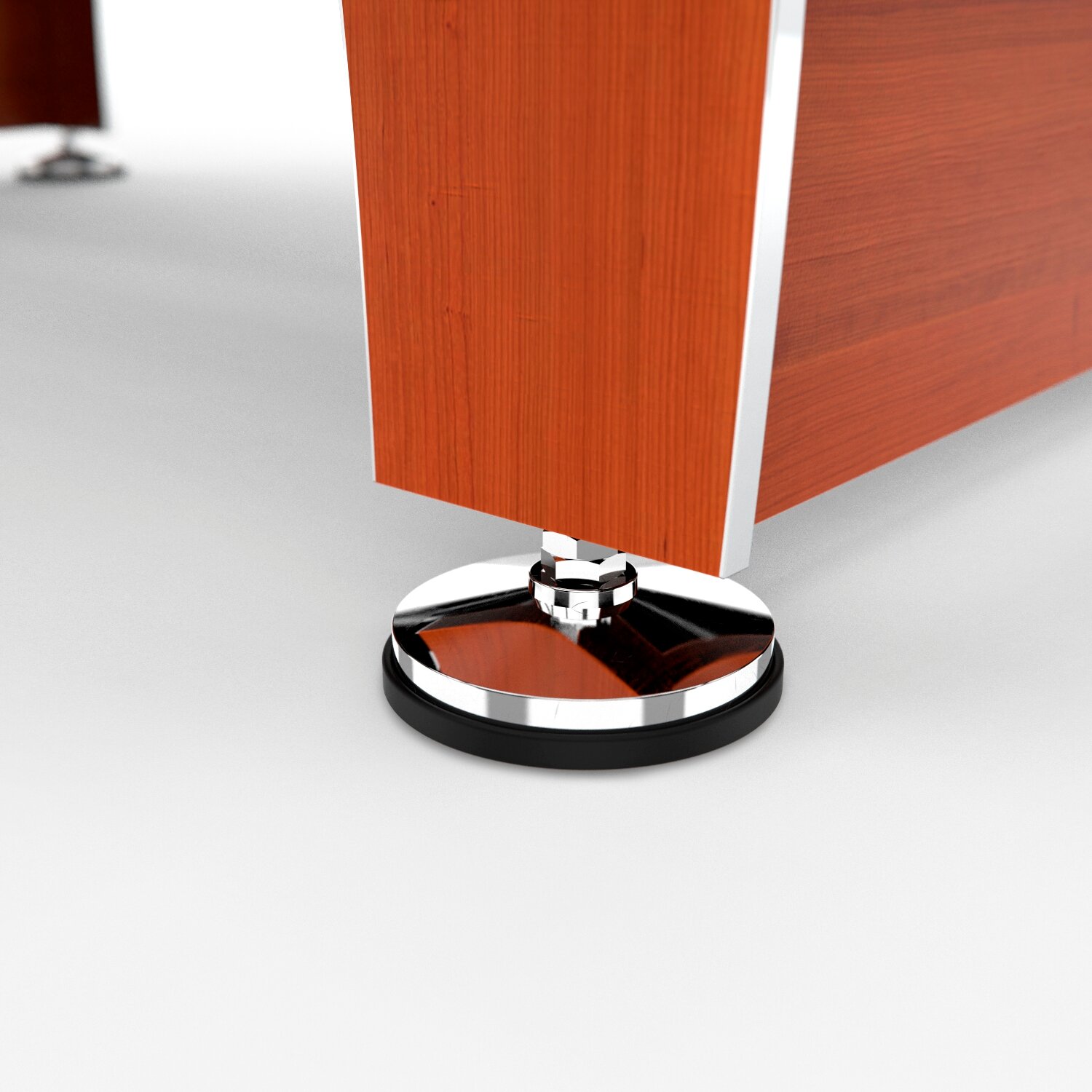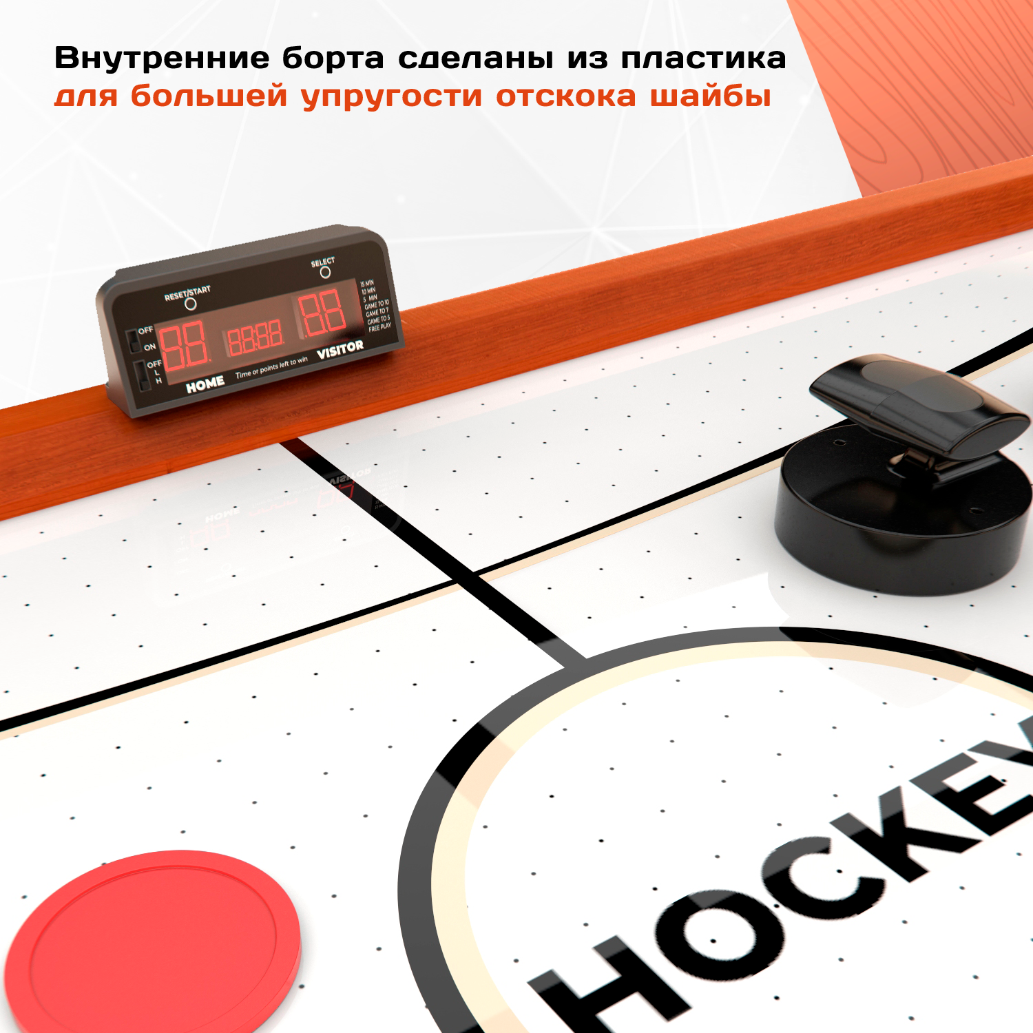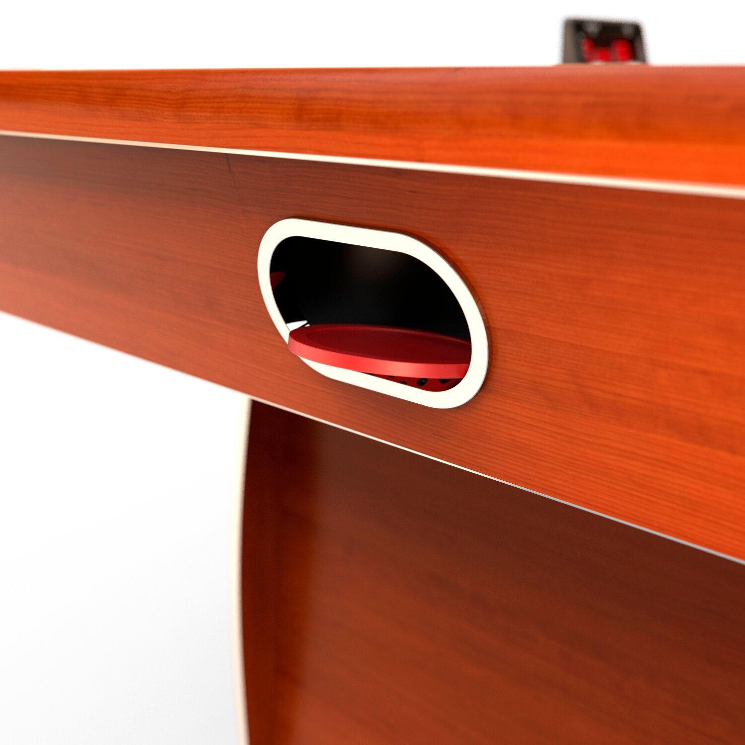 Игровой стол – аэрохоккей DFC AT-350 модель для домашнего использования размером 90 дюймов. В комплекте 4 биты и 4 шайбы, а также электронный счётчик очков. Стол имеет компенсаторы неровности пола. Бортики по краям поля тёмно-вишневого цвета из МДФ с ПВХ покрытием, изнутри со стороны поля – из АБС-пластика. Размеры бортиков составляют 9 х 3,8 см, хромированные пластиковые уголки - толщиной 3,8 см. Боковые стороны сделаны, как и бортики, из МДФ вишнёвого цвета, их размер составляет 17 х 1,6 см, верх и низ, а также углы по краям с хромированной отделкой. Ножки из МДФ 2,5 см по краям отделаны хромом, торцевые части со стороны игроков толщиной 9 мм; компенсаторы неровности пола, покрытые хромом, имеют диаметр 15 см.