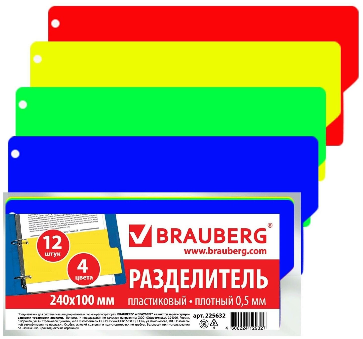 Изготовлены из пластика толщиной 0.5 мм. В комплект входят 12 разделителей размером 105×240 мм синего, красного, зеленого и желтого цвета, обеспечивающих возможность сортировки документов по цветам. Универсальная перфорация позволяет подшивать разделители во все типы папок.